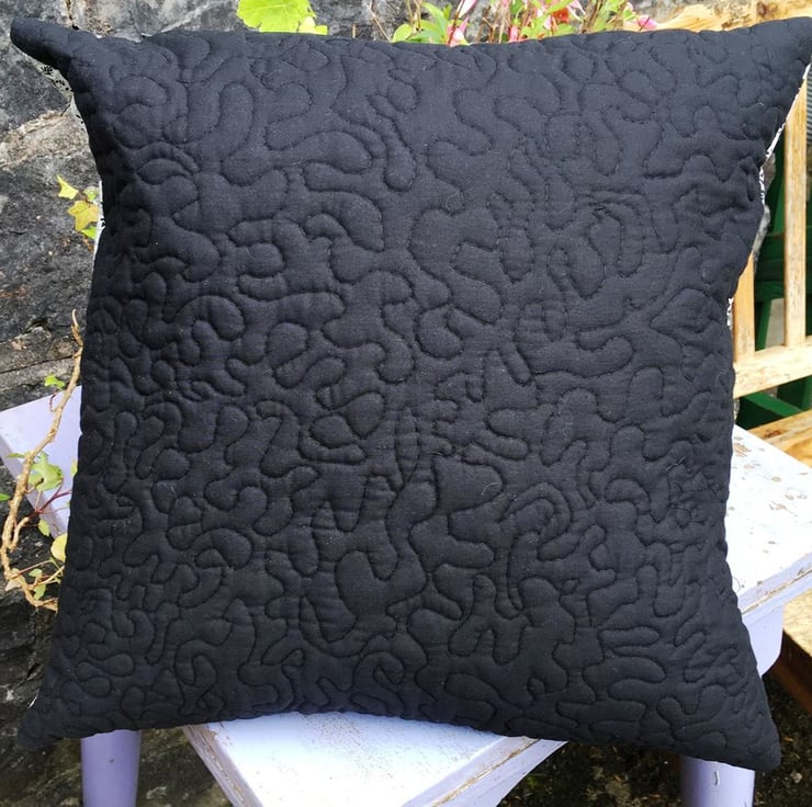 This cushion is part of my quilting and hand embroidery journey. I was experimenting with free motion quilting (stippling) and hand embroidering my own design from my own artwork.