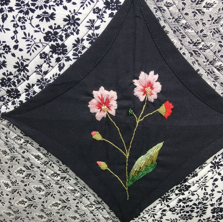 "Floral Spray" is a unique quilted/hand embroidered & beaded cushion/cover, in black and ivory.