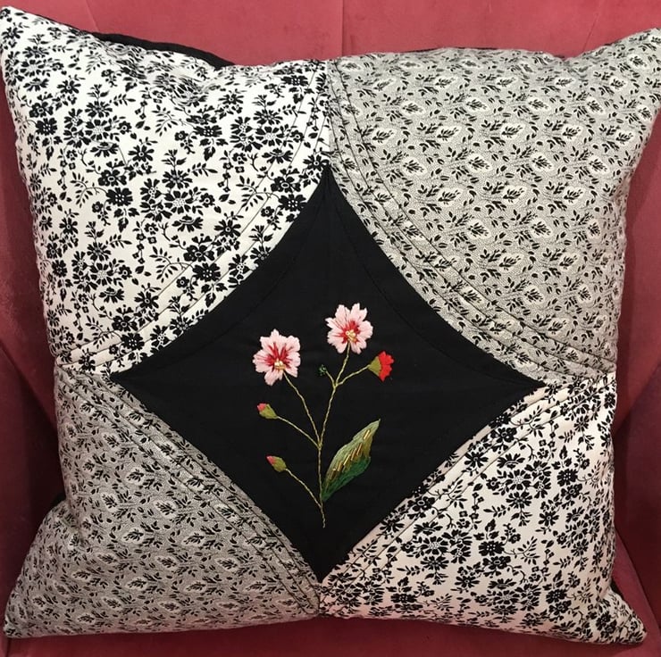 This cushion is part of my quilting and hand embroidery journey. I was experimenting with free motion quilting (stippling) and hand embroidering my own design from my own artwork.