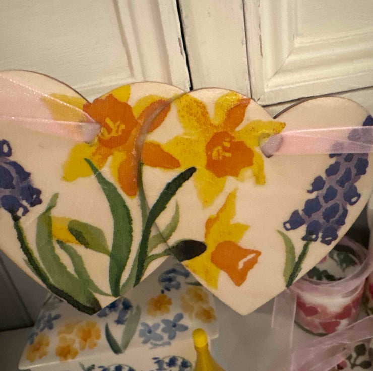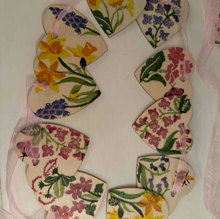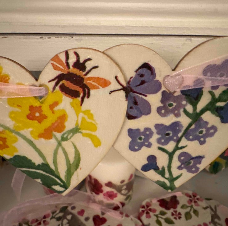 I have used mod podge gloss lustre for a subtle sheen and seal, 5 double hearts on a pink shimmer ribbon ready to hang
