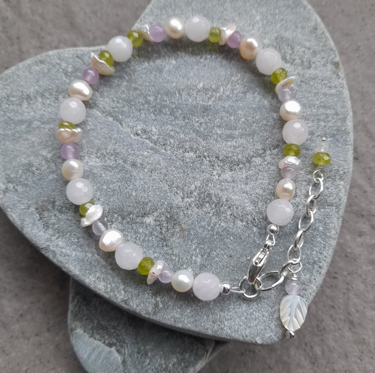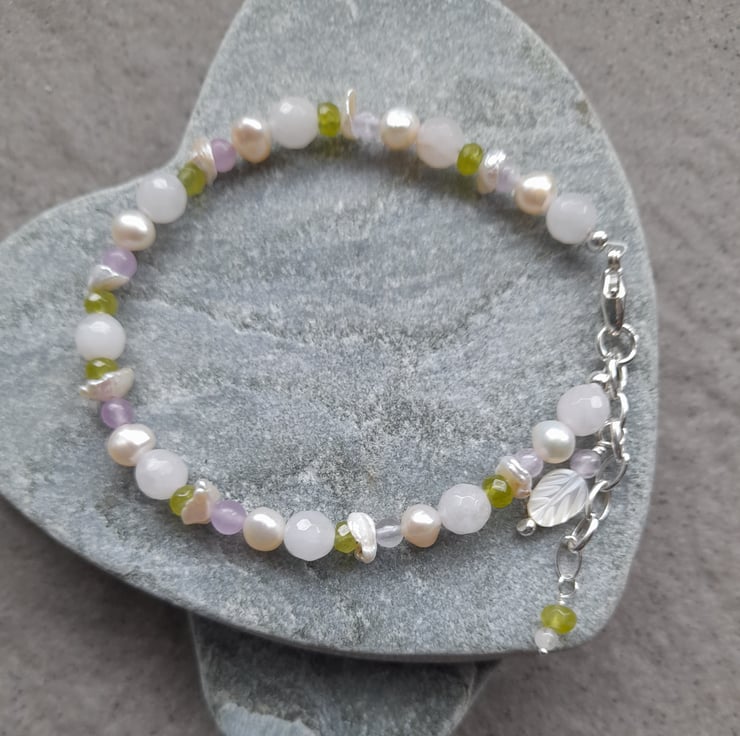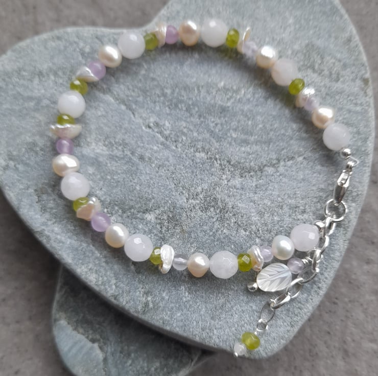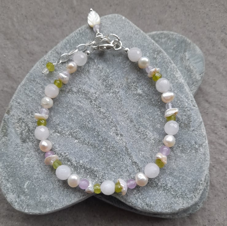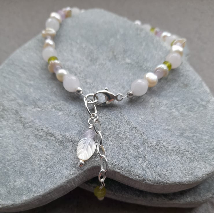 Freshwater cultured pearls, very pale pink rose quartz, peridot, lilac quartz and keshi pearls