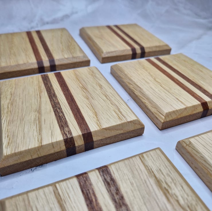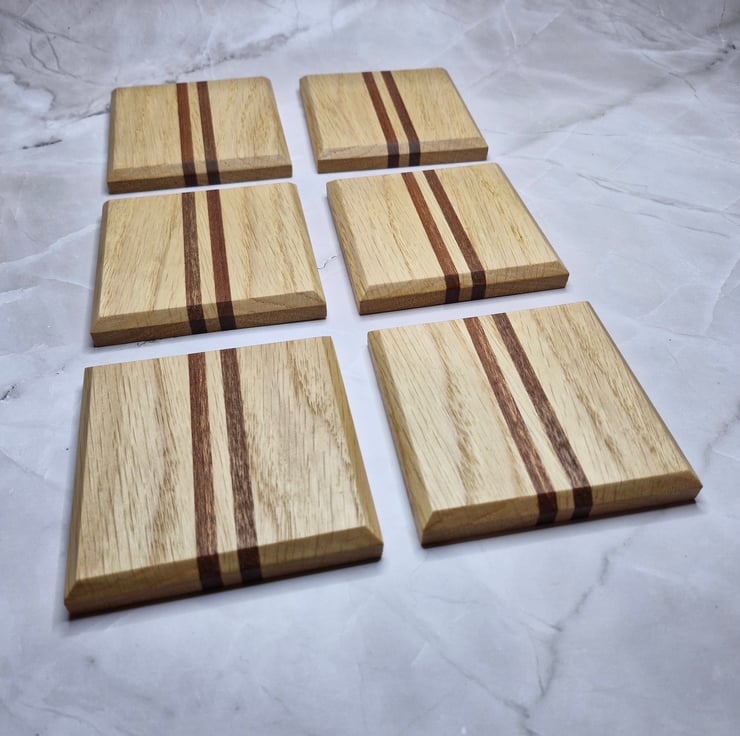 These coasters are handcrafted from solid Oak with two strips of Meranti down the centre. The contrast between the two types of wood provides a simple, yet effective design.