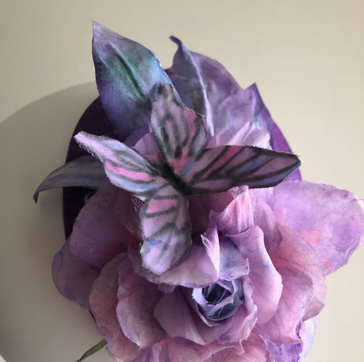 Real silk hand painted cut out and shaped pink and purple colour with silk butterfly hand painted.comes with headband or you can use crocodile clip.you can then position the hat at what angle you like.for wedding’s cocktails or personal wear. The base is 11cm. Original one off.
