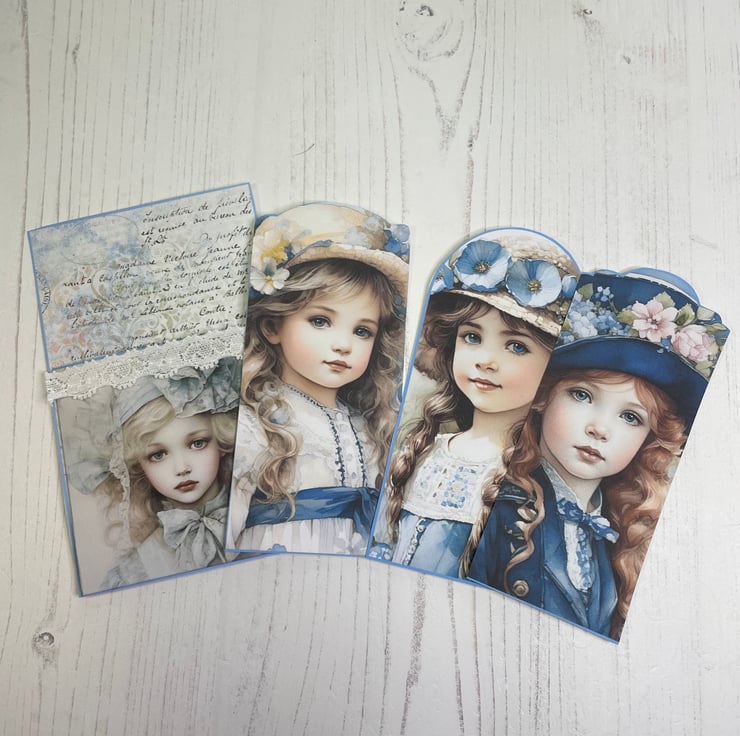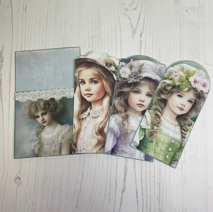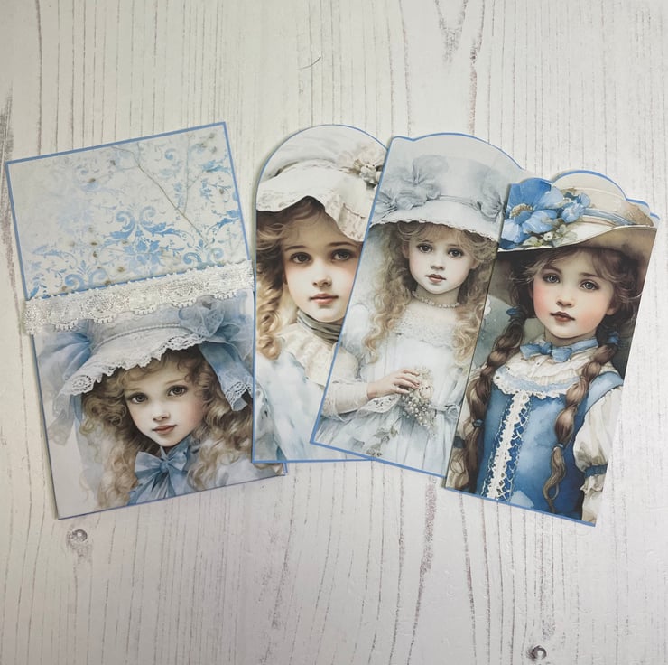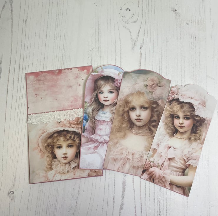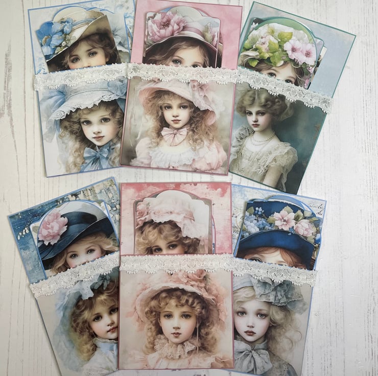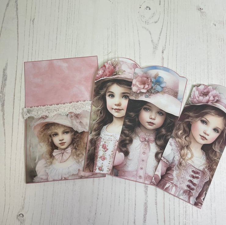 Set of 6 tag pockets with 3 tags in each. All with a pretty Victorian Girl theme. Lace edging on the pocket. Pockets Measure 4.75” x 2.75”. Perfect to add to a journal or pop in a card as a thank you.