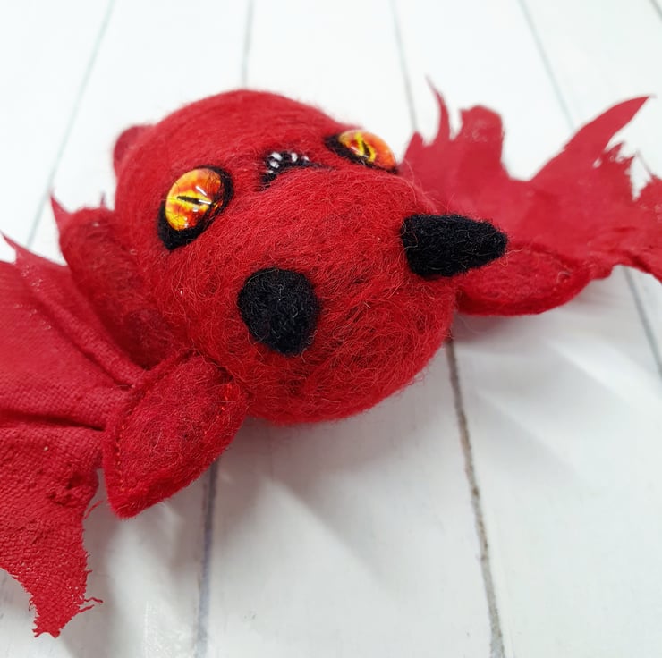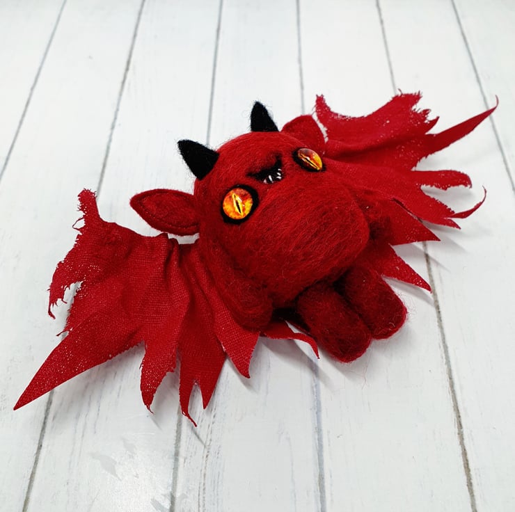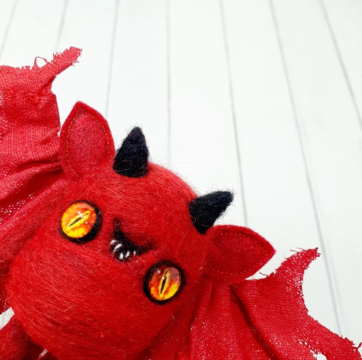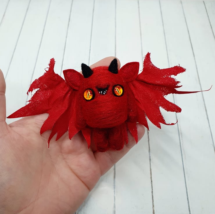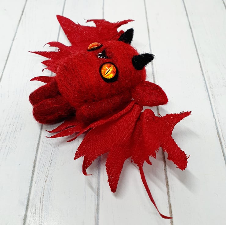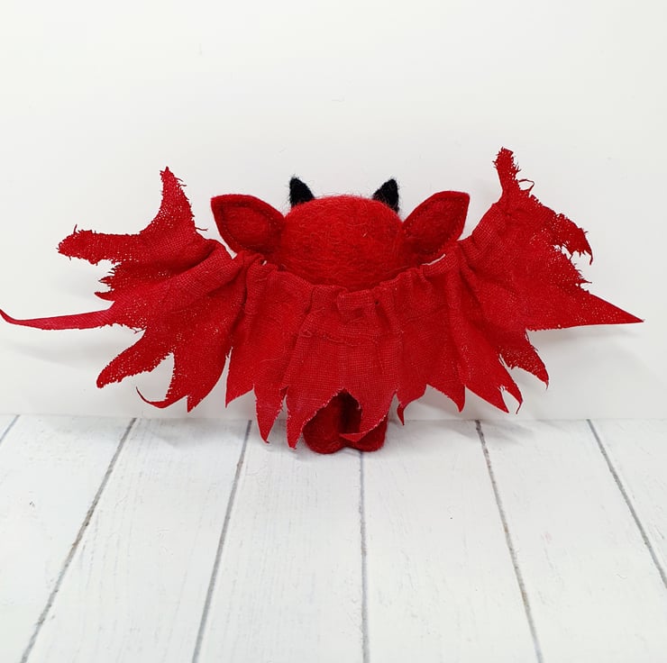 This miniature, needlefelted art doll is demonically charming with fiery glass eyes and little black horns. The body is needlefelted and the ears are sewn felt. Nefarious has a naughty little smile with hand sewn teeth. The wings are hand cut and pulled to look jagged and asymmetrical. These wings are painted linen and are sewn into place. Nefarious measures roughly 7cm tall with a 16cm wingspan.