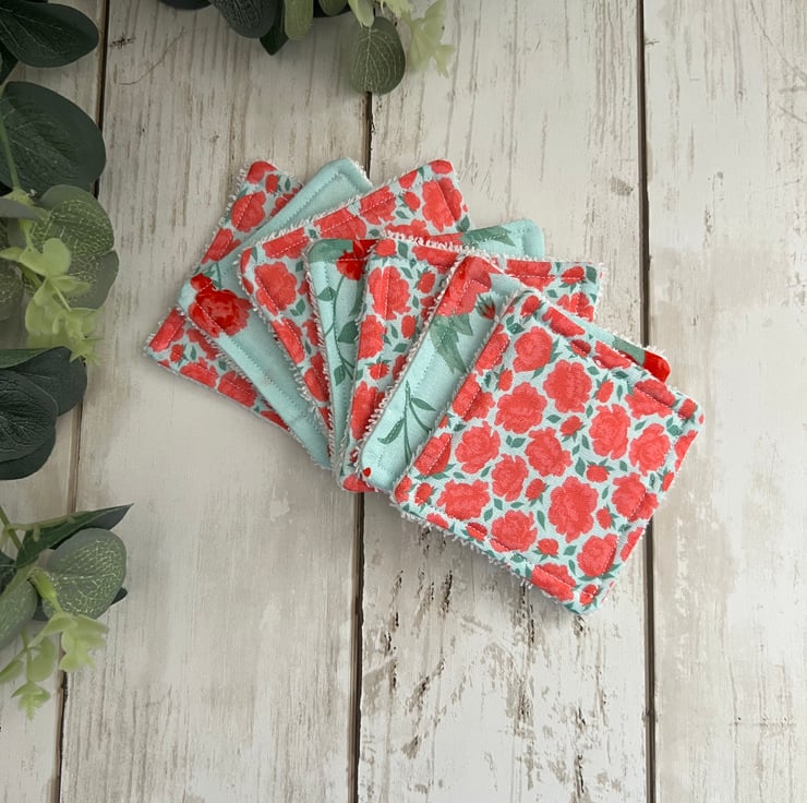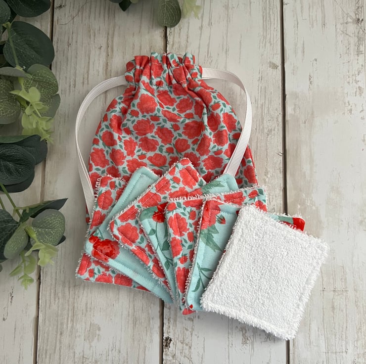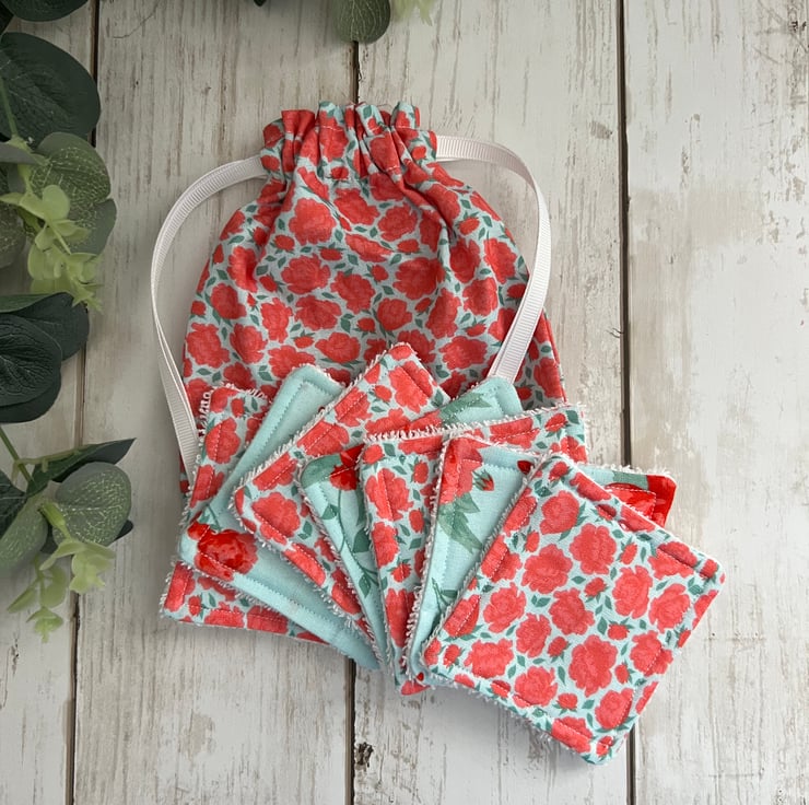 Handmade pack of 7 reusable square facial wipes with a matching drawstring storage bag.