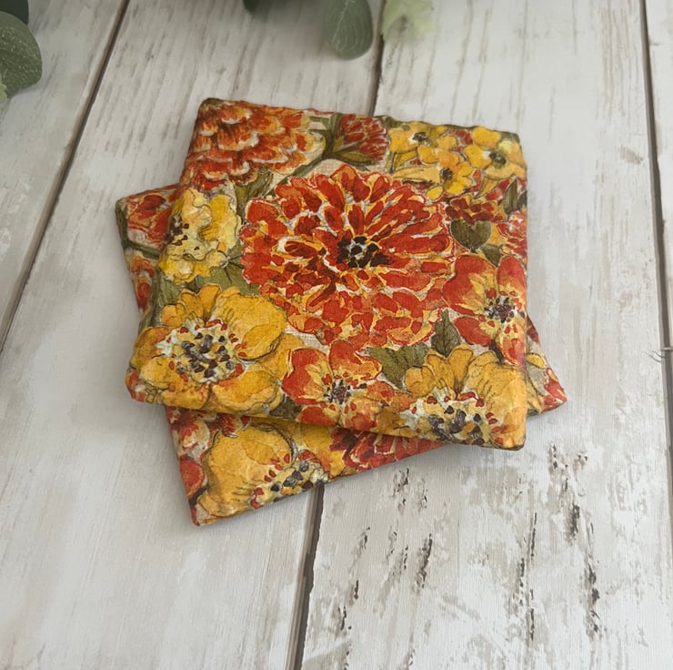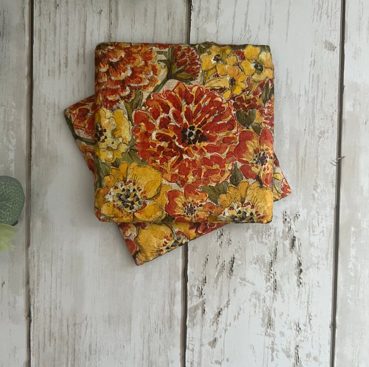 The slate coasters have been painted to one side and decoupaged with a lovely Autumnal floral design in orange and yellow tones and finished with many coats of heat and water resistant varnish for protection. The reverse of each coaster has 4 rubber feet to protect your furniture.