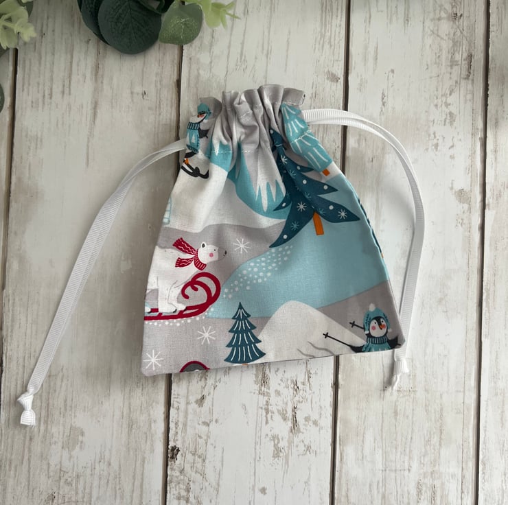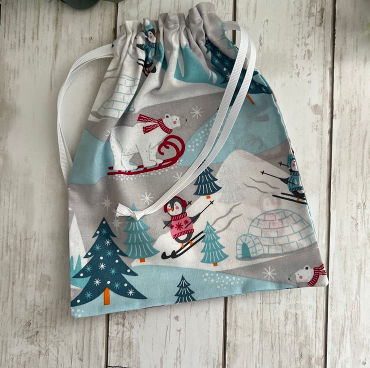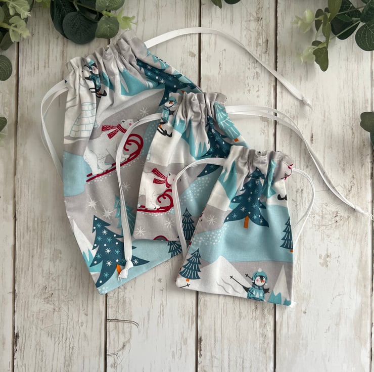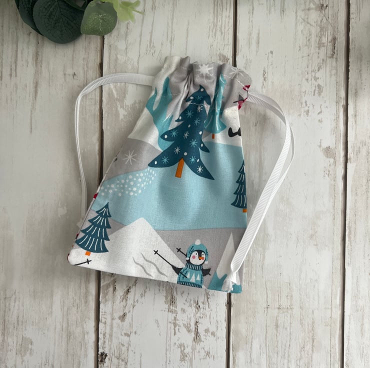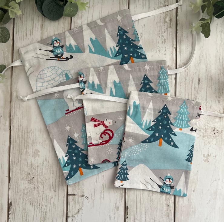 These bags have been finished with a lovely snowy ski scene with penguins and polar bears fabric with a co-ordinated white grosgrain ribbon for the ties.