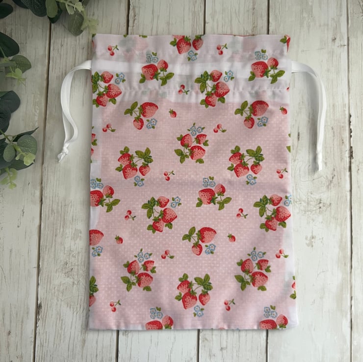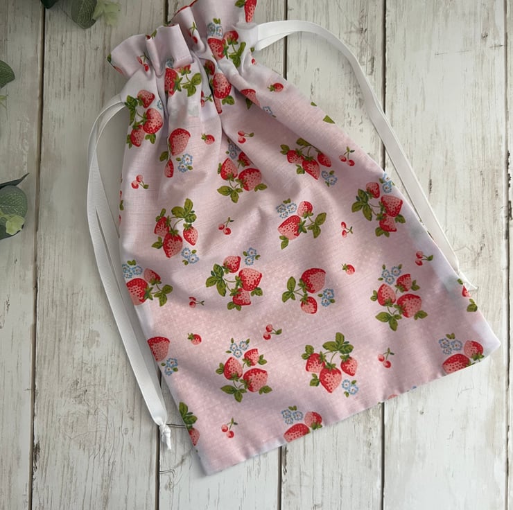 This bag has been finished with a lovely strawberry fabric with a co-ordinated red polka dot fabric for the lining and a white grosgrain ribbon tie.