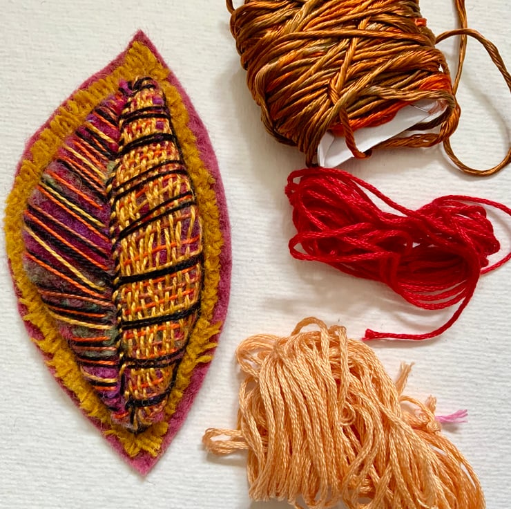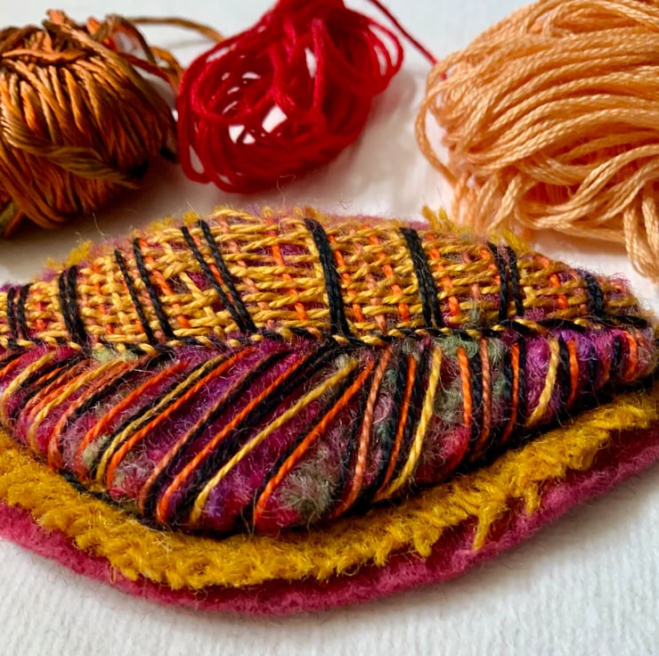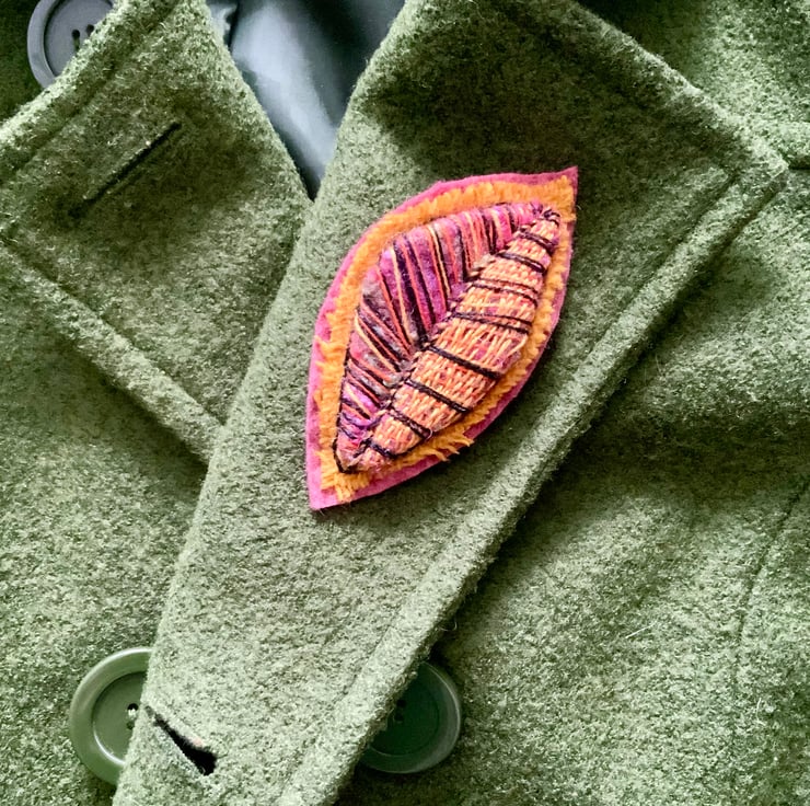 This brooch has been made using felted hand woven cloth plus bought felt and Harris tweed fabric. I have embellished it hand embroidery. It measures 5cm width x 9.5 cm length and comes with a silver plated brooch back. A pretty leaf brooch to brighten up your jacket, jumper, scarf or bag.