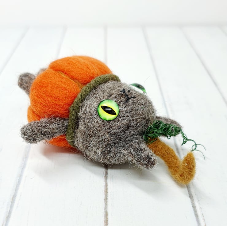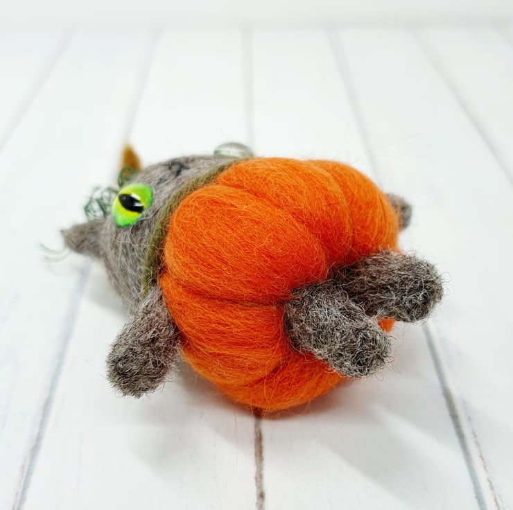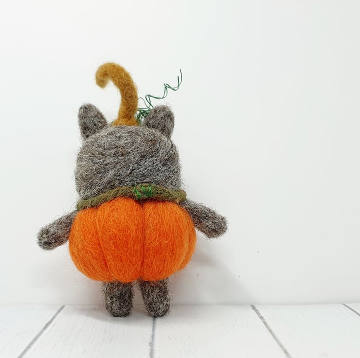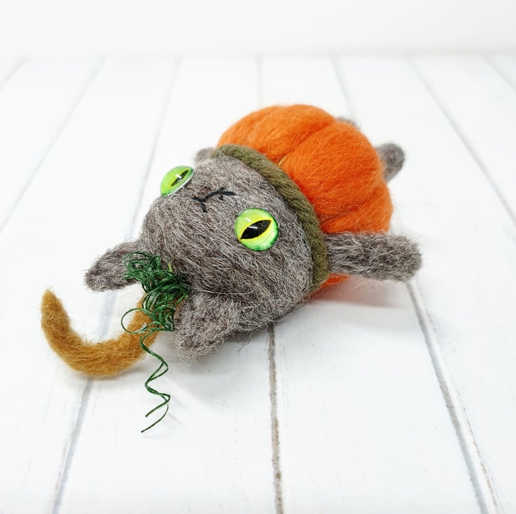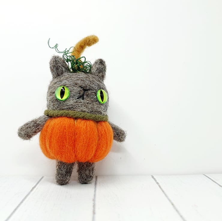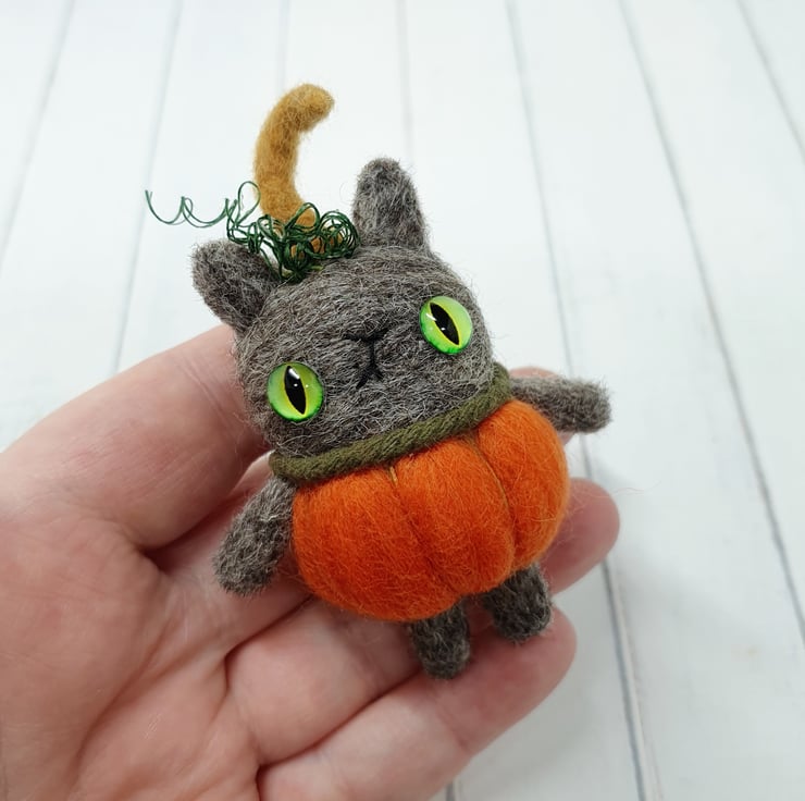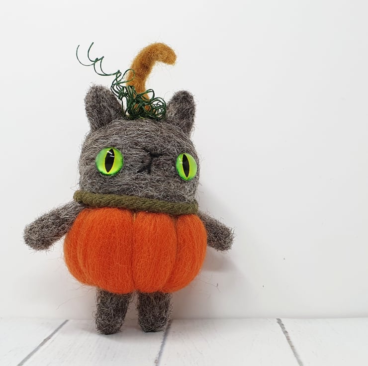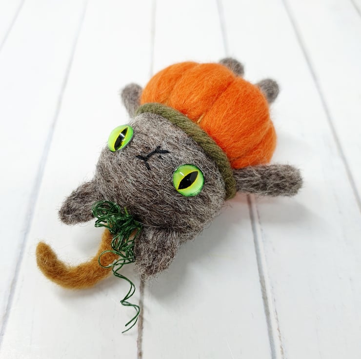 Sweet little needlefelted grey kitty wearing a fluffy wool pumpkin. Pumpkin is topped with upcycled green thread rope. This kitty has glass eyes and hand embroidered facial details. The kitty has needlefelted stalk with Curly thread greenery atop it's head. Kitty measures roughly 9cm tall.