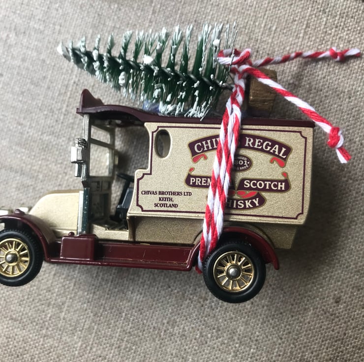 Carefully collected die cast vehicles and re purposed into CHRISTMAS decorations. Perfect for WHISKY collectors. Shelf decor and unique gift topper. 3”