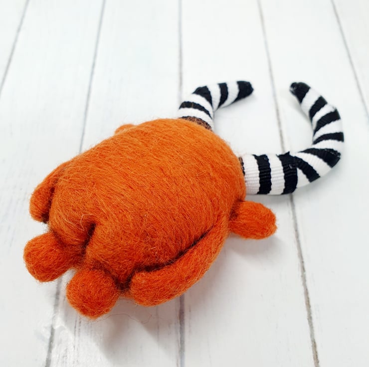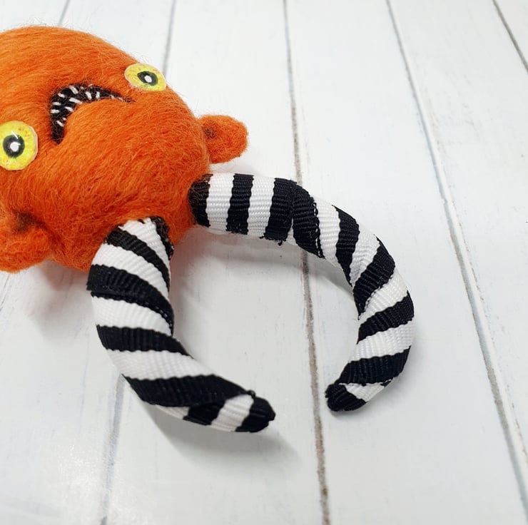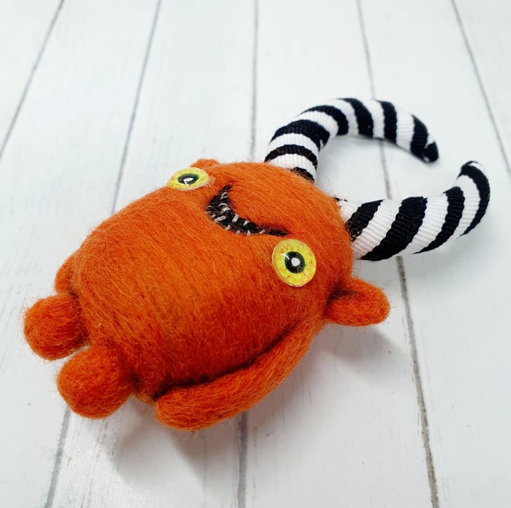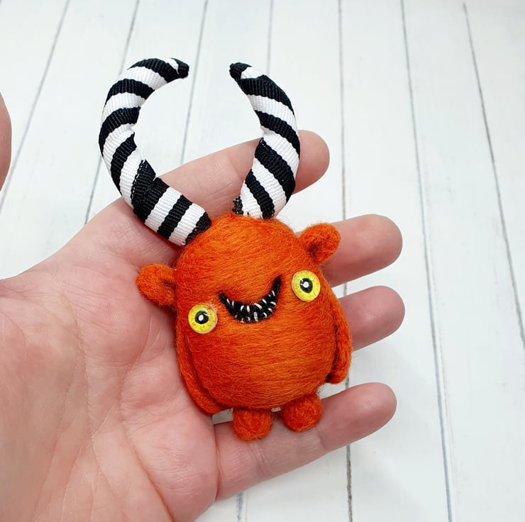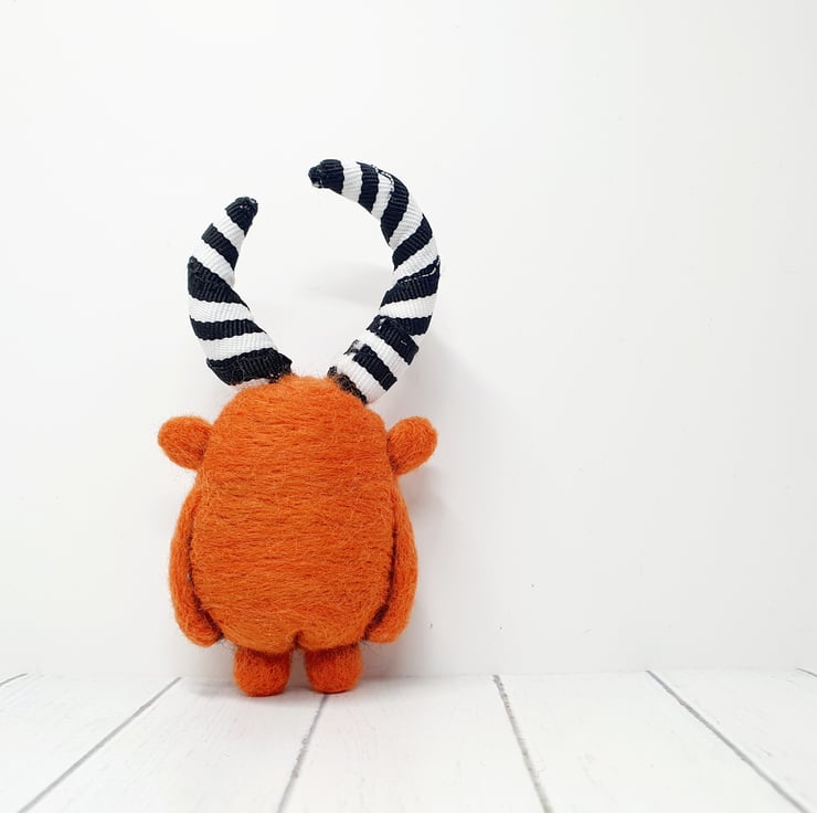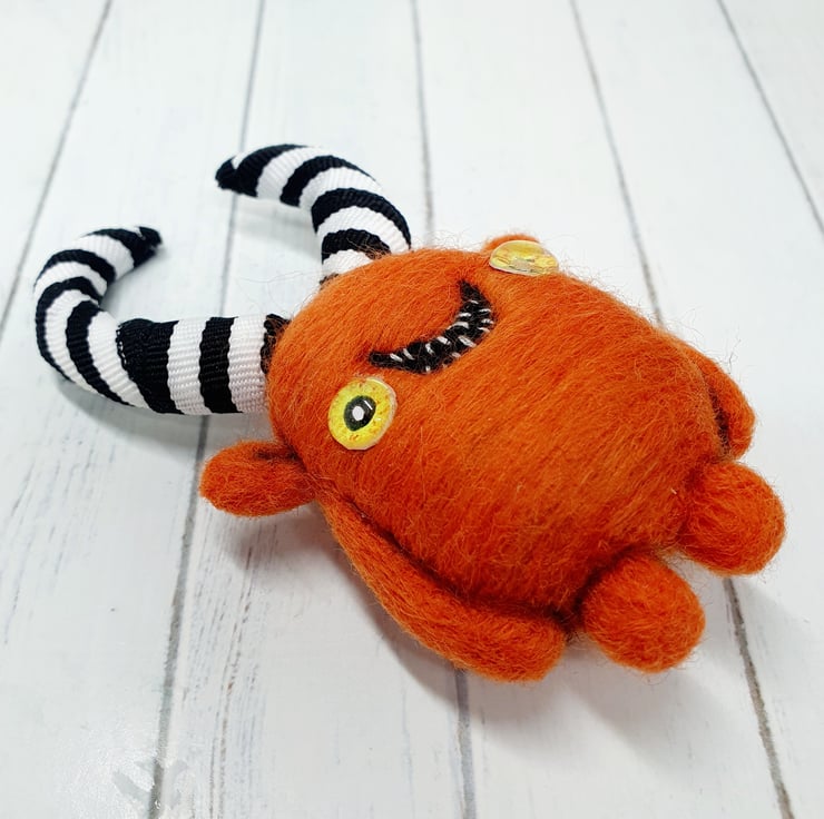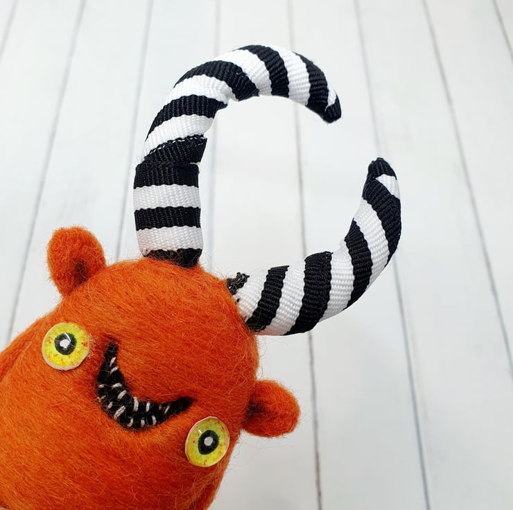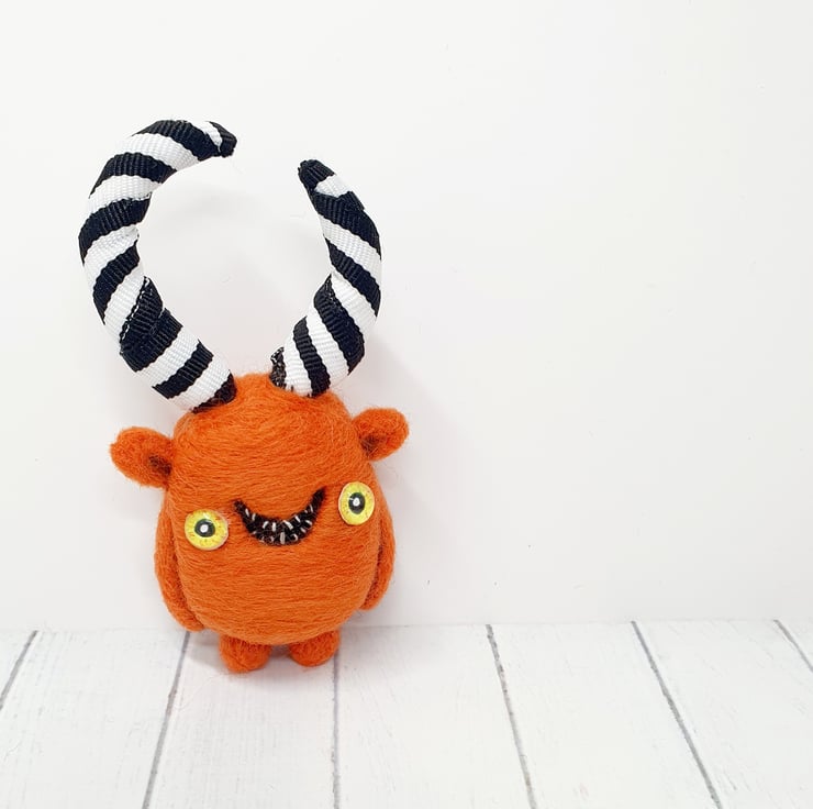 Needlefelted wool monster with monochrome striped horns and glass eyes. This monster has asymmetrical wired horns wrapped and sewn with black-and-white striped trim. Monster has hand embroidered teeth in its big smile and cute little bottom. Monster measures roughly 10.5cm tall.