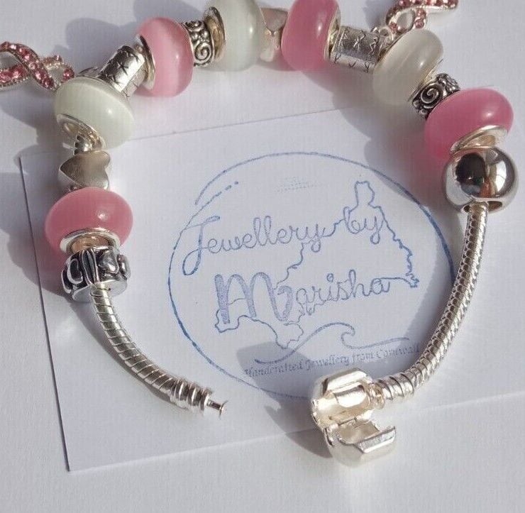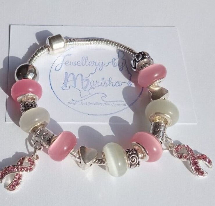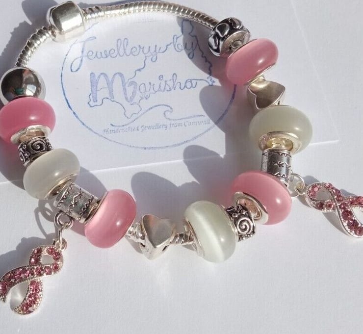 Handmade Pink & White Breast Cancer Awareness European Charm Bracelet with Dangly Ribbon Charms.