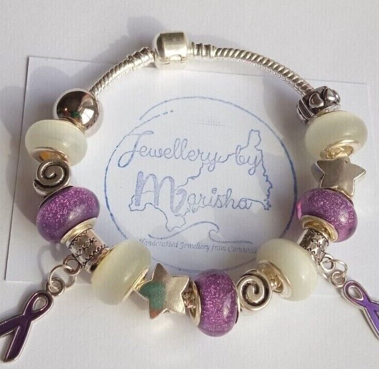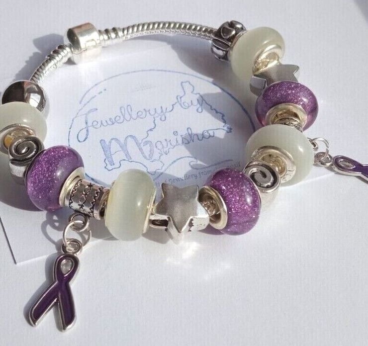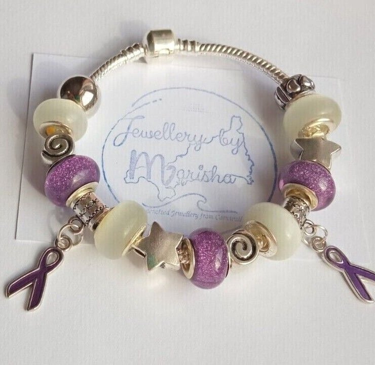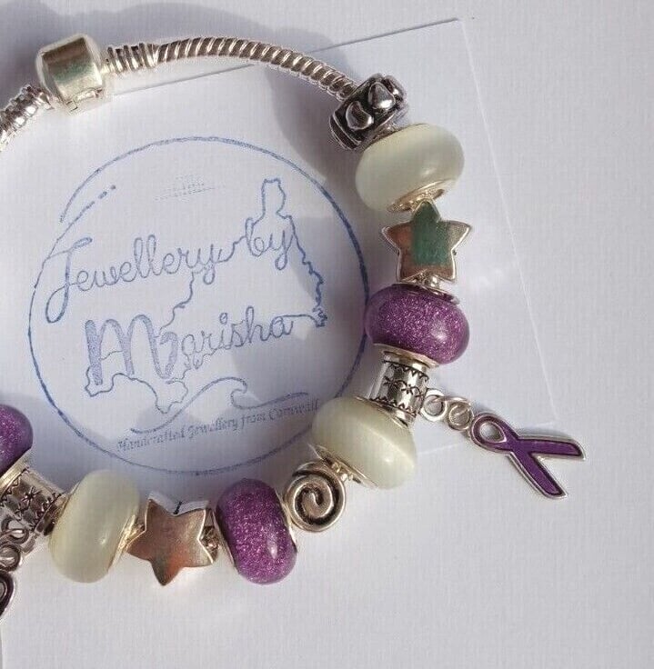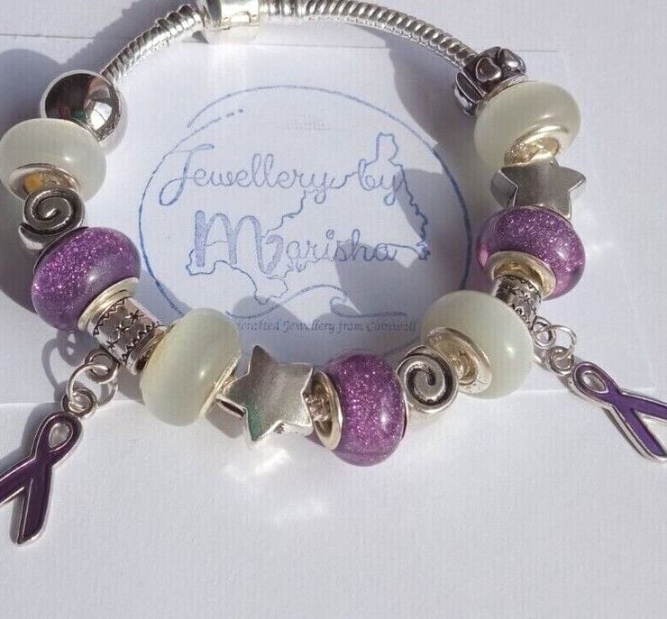Handmade Purple Ribbon Cancer Awareness European Charm Bracelet with Dangly Ribbon Charms.