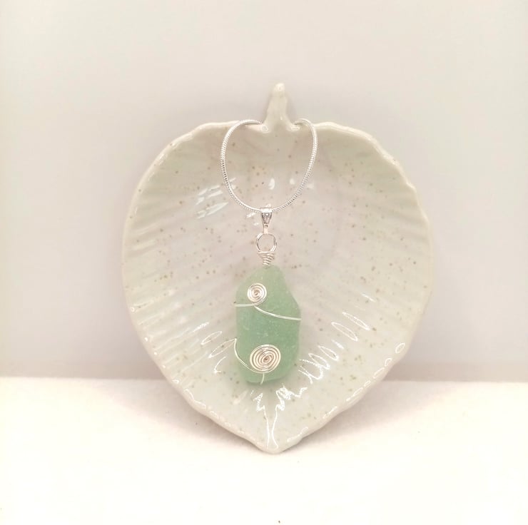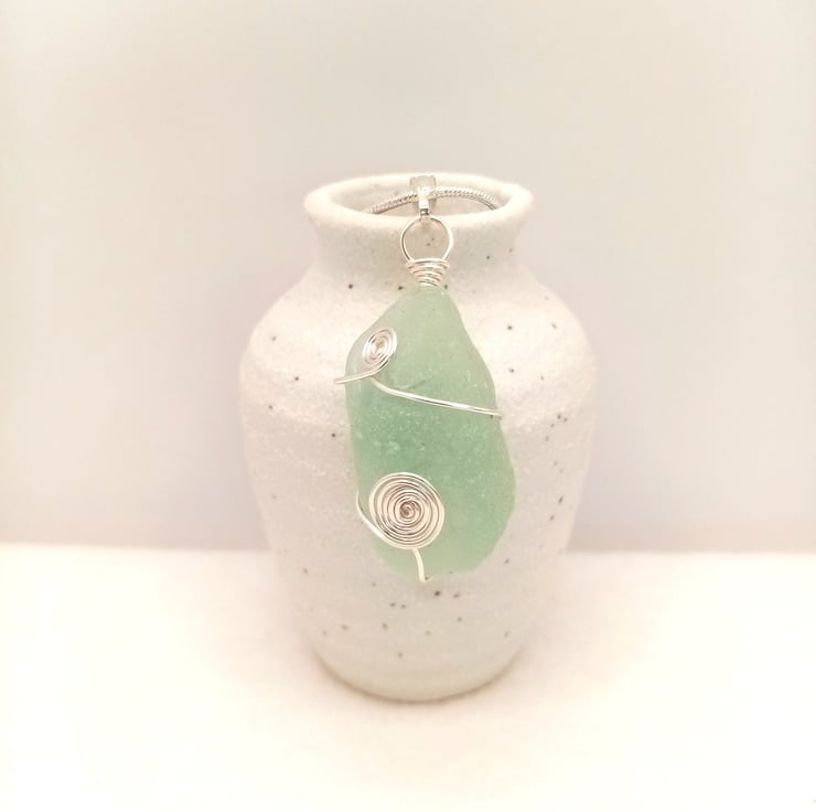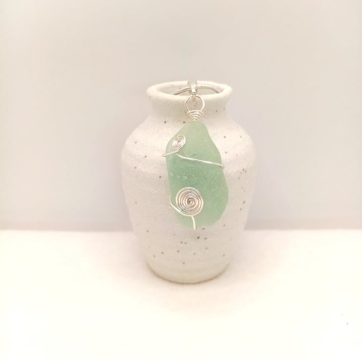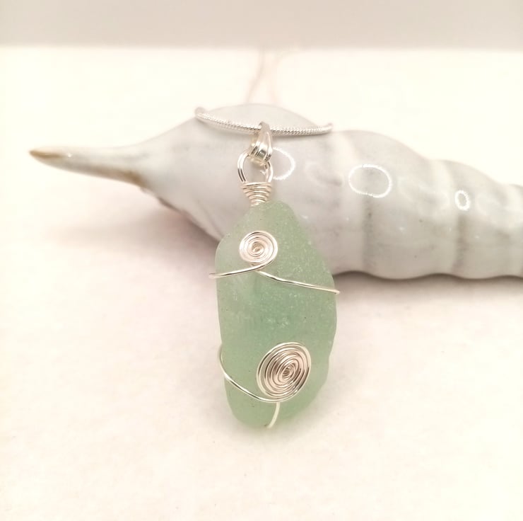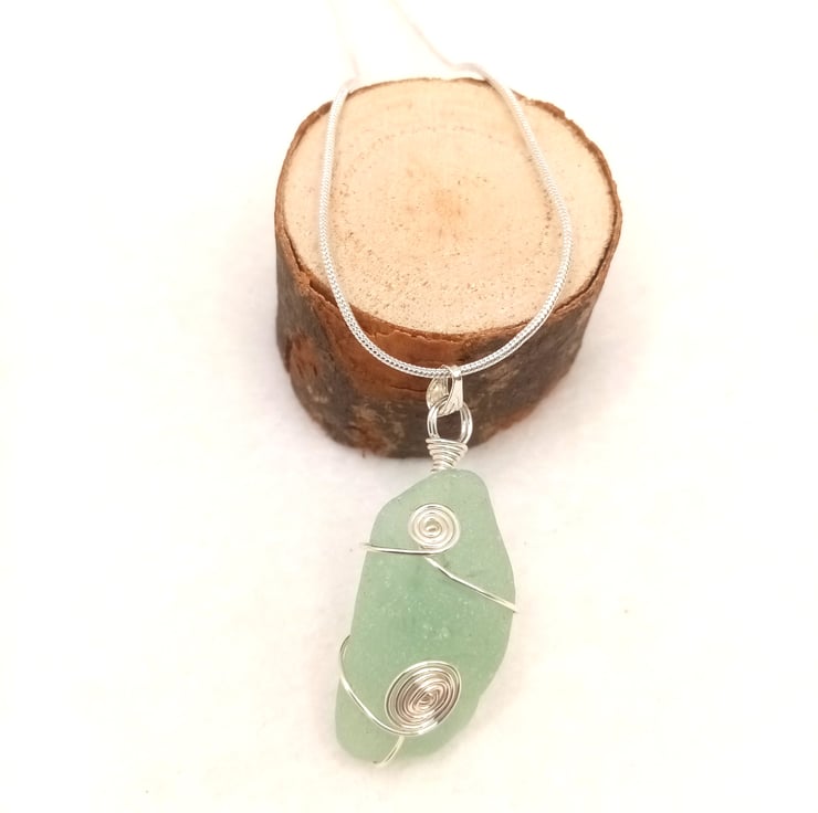 Wire wrapped sea glass pendant in aquamarine with silver plated snake chain.