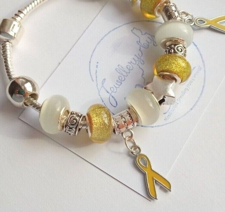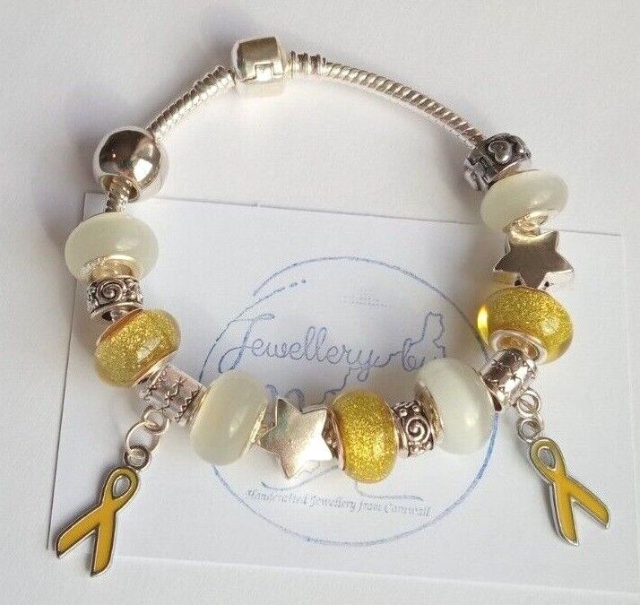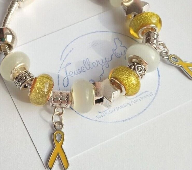 Handmade Yellow Glitter & White Cancer Awareness European Charm Bracelet with Dangly Ribbon Charms.