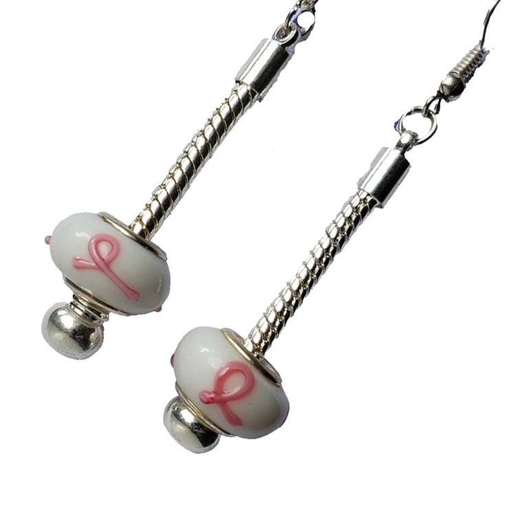 Pink Ribbon Breast Cancer Awareness European Charm Beads on Dangly Earrings