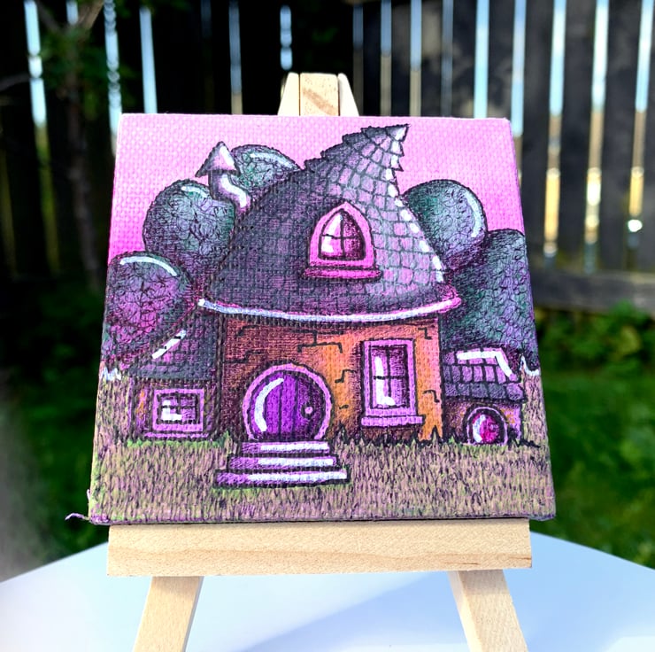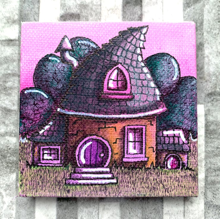 Miniature watercolour, pen and ink illustration of a small house at the bottom of the garden, on a 7x7cm canvas supplied with a display easel. I love to create these tiny scenes with vibrant background colours overlaid with my distinctive pen and ink illustrations. Each one is an original piece of art.