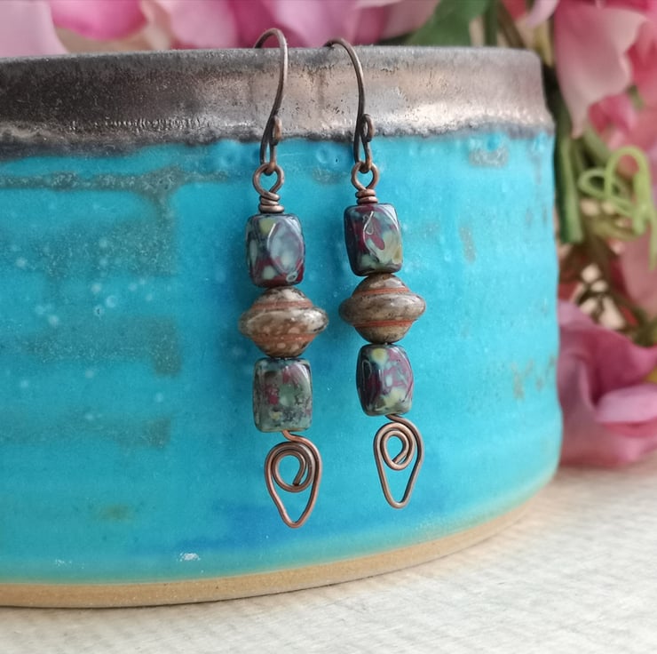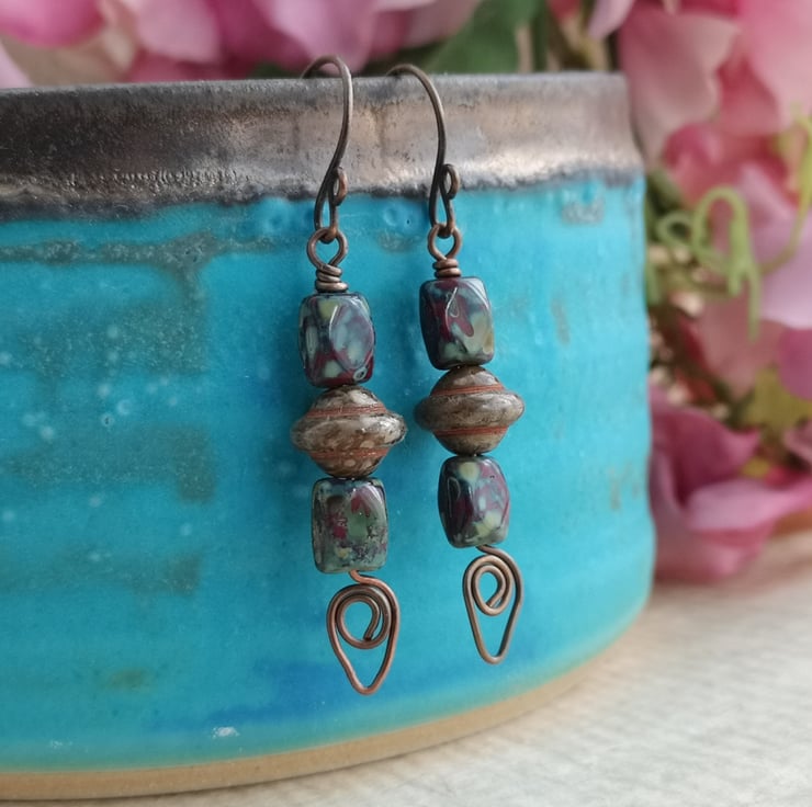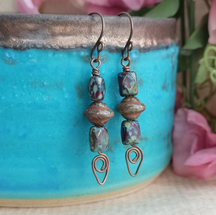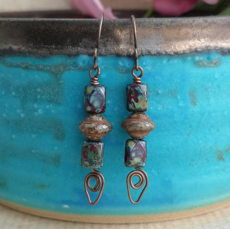 These earrings feature high quality Czech glass beads in earthy tones of dark red and soft brown. They have a Picasso finish, which is a lustre coating that appears more speckled and spotty, giving the beads a more natural appearance. They sit above decorative copper wire and hang from hand formed copper ear wires.