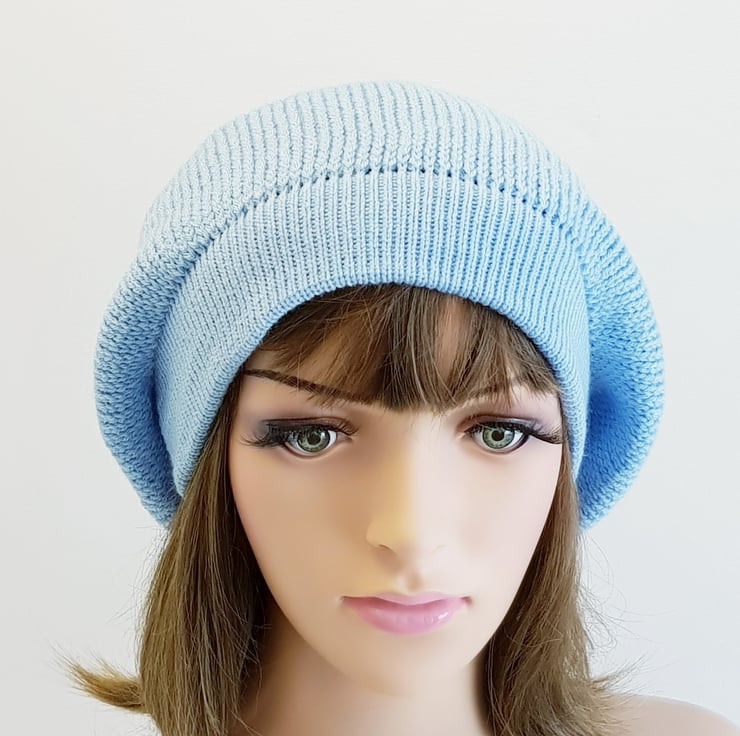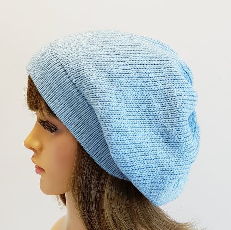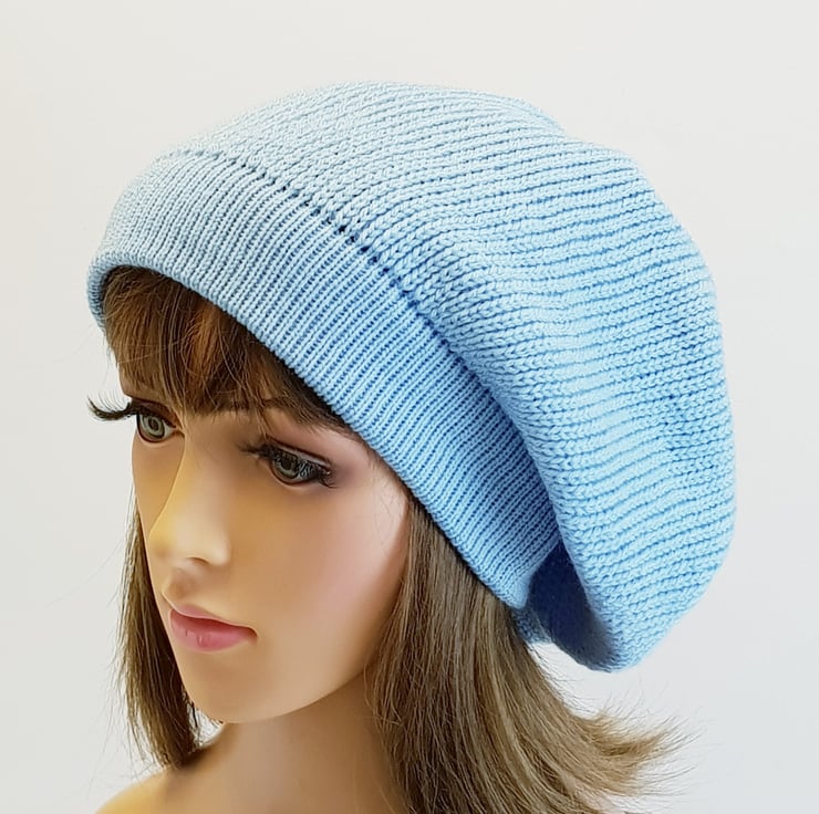 Handmade sky blue baggy beanie hat for women, fall beret, knitted tam.