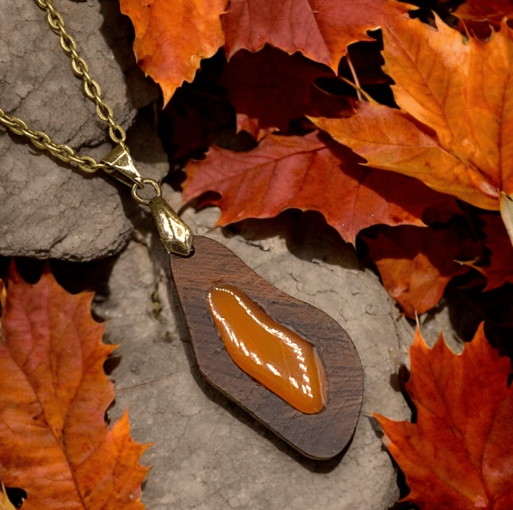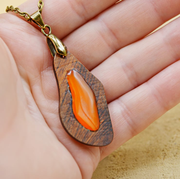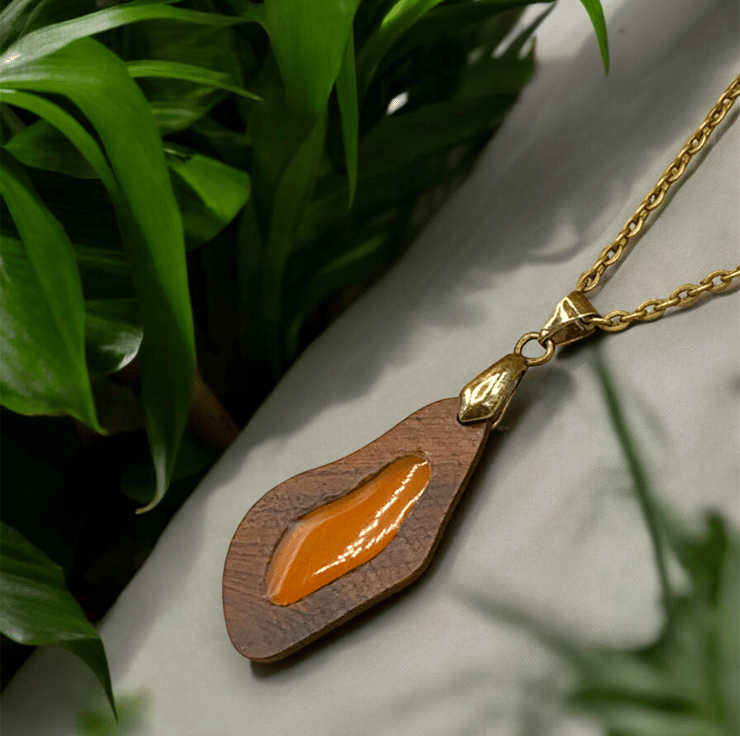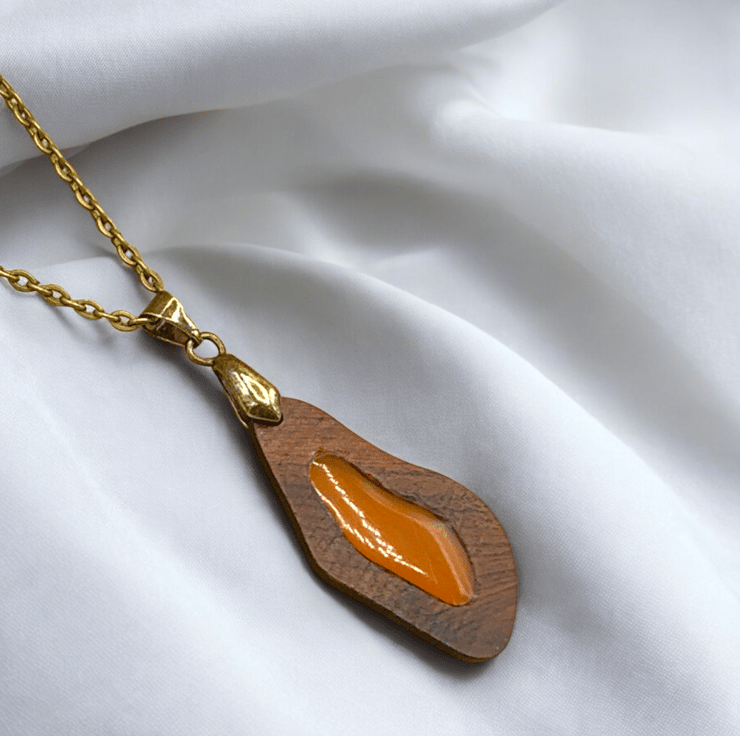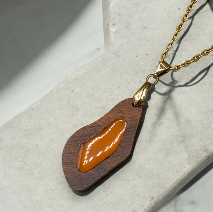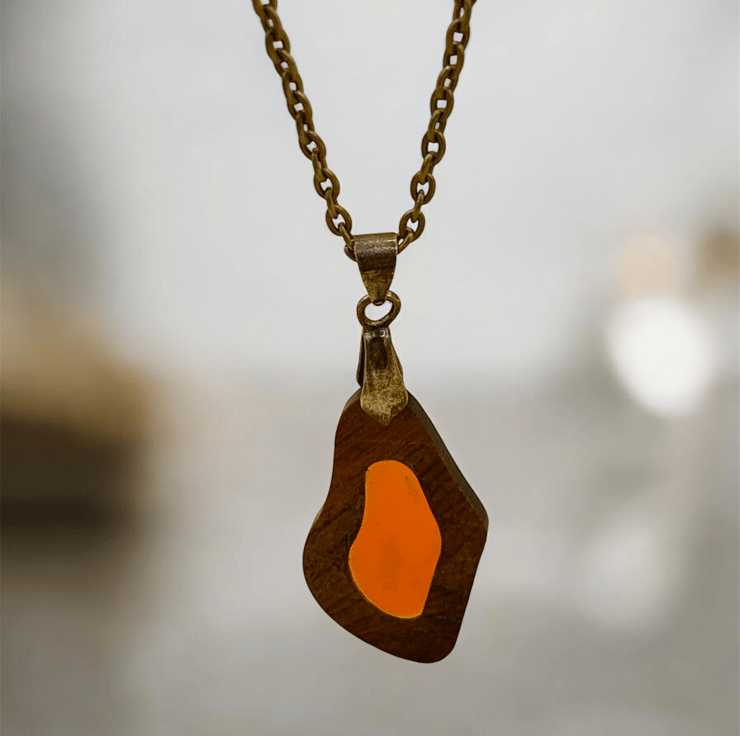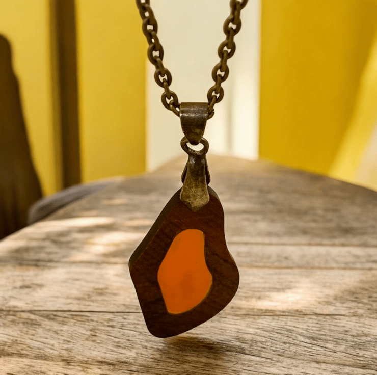Resin & Wood Pendant Necklace - Orange Abstract Design, Lightweight Brass Chain