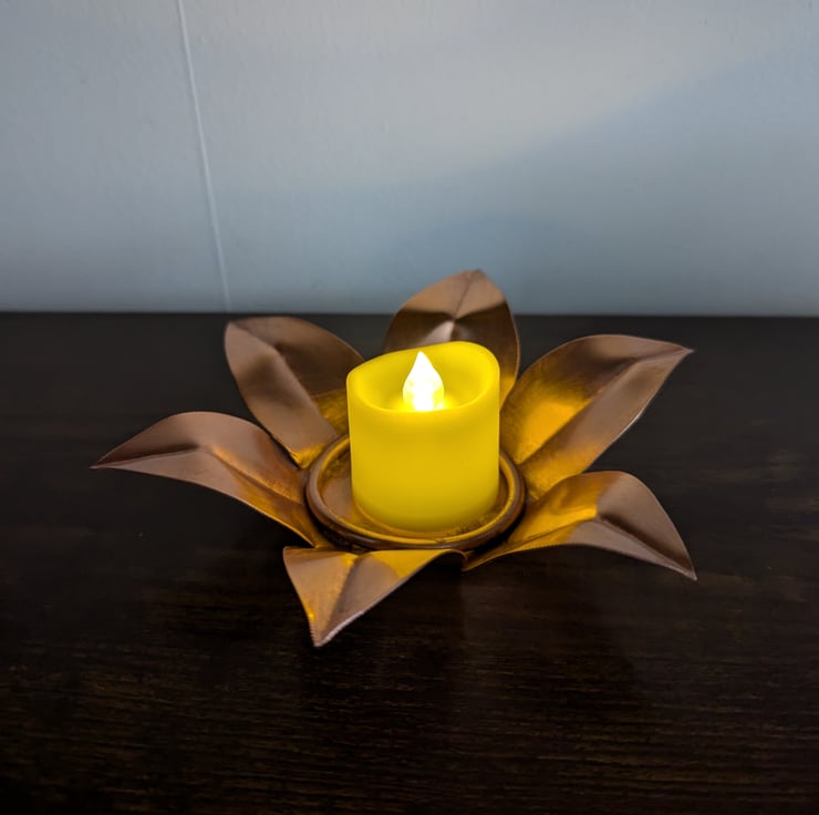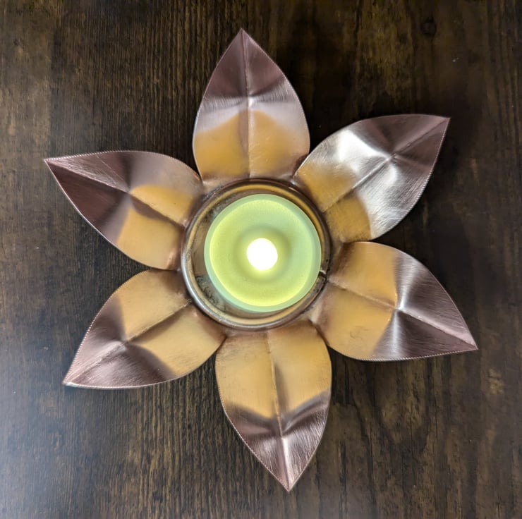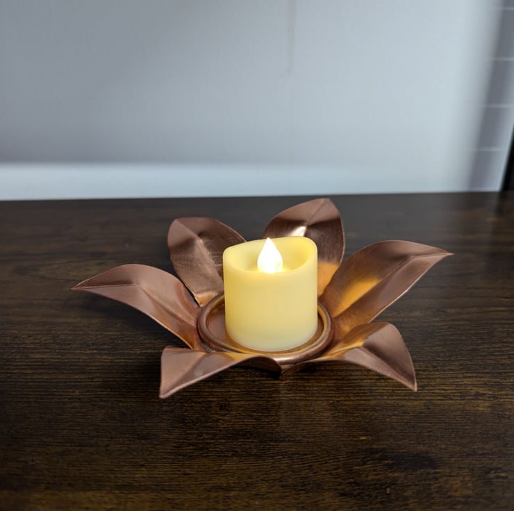 Elevate your home decor with this lovely 100% copper flower shaped copper tea light holder. The lacquered top preserves the shine, adding a touch of elegance. Makes an ideal copper anniversary gift. The warm, flickering glow of a candle casts a cosy ambience in your living space. Measuring approximately 6" in diameter, this tea light holder strikes the perfect balance between form and function. Enhance your surroundings with this captivating centrepiece.