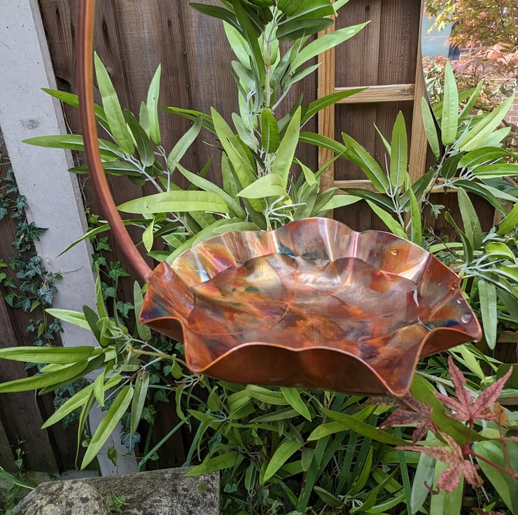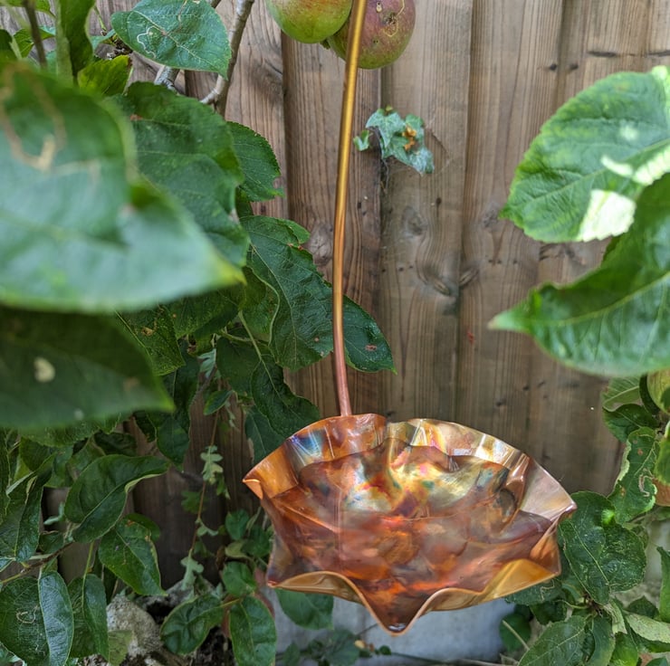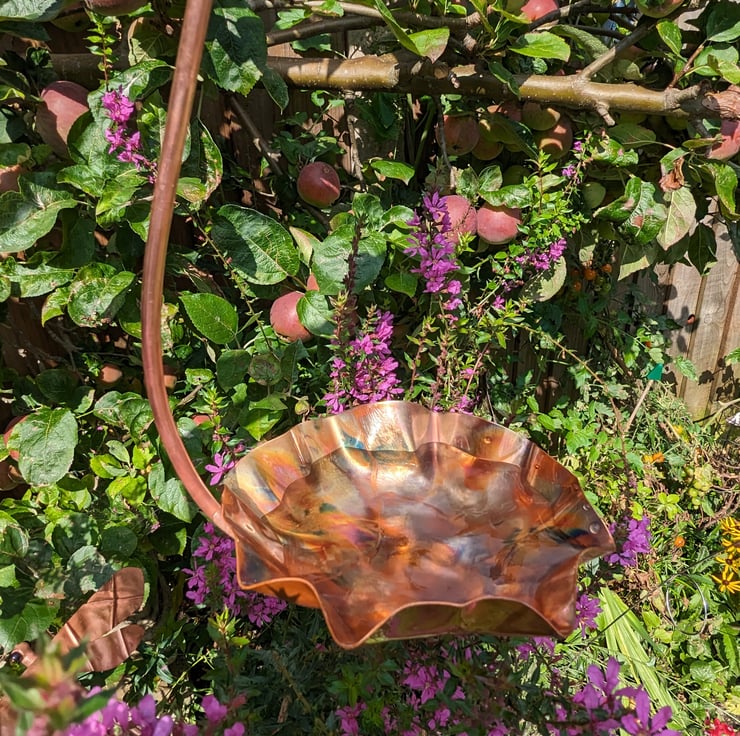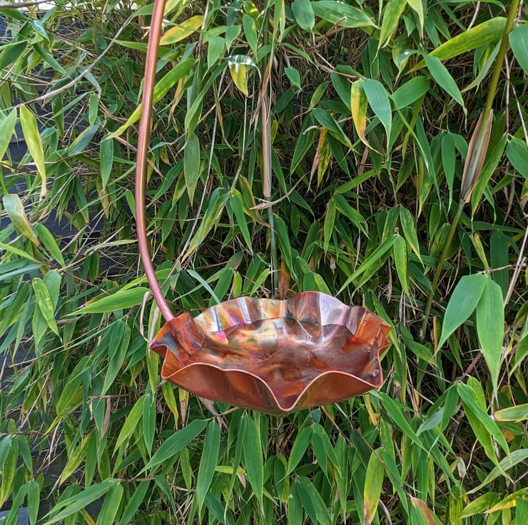 Add a touch of elegance and functionality to your outdoor space with this stunning 6" hanging copper bird bath. The bath's unique, fluted shape and vibrant flame-colored finish create a captivating focal point. Handcrafted from durable copper and coated with protective lacquer, this bird bath will withstand the elements and provide a refreshing oasis for your feathered friends. Hang it from a tree branch or other suitable outdoor structure to enjoy the beauty of nature up close. Ideal gift for a bird watcher while also helping our feathered friends.