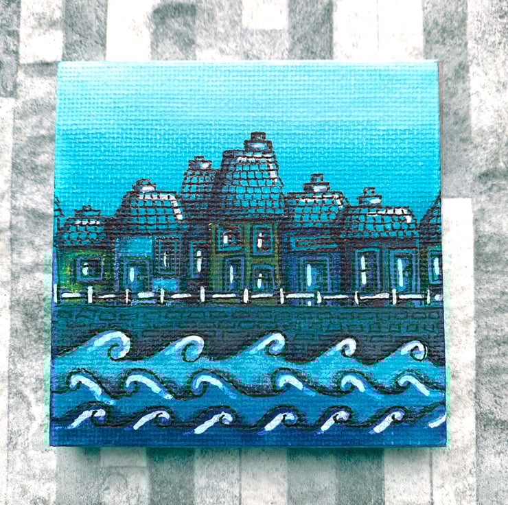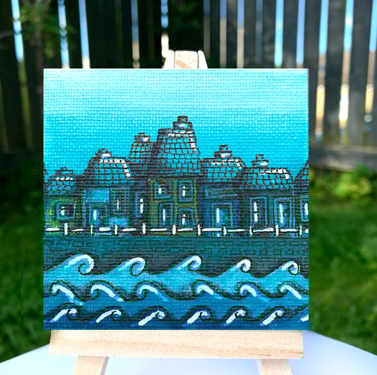 Miniature watercolour, pen and ink illustration of Harbour Houses on a 7x7cm canvas supplied with a display easel. I love to create these tiny scenes with vibrant background colours overlaid with my distinctive pen and ink illustrations. Each one is an original piece of art.