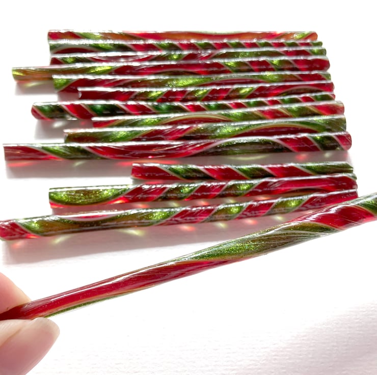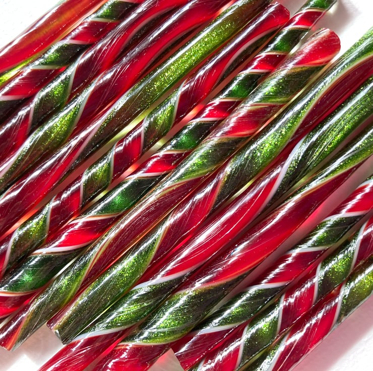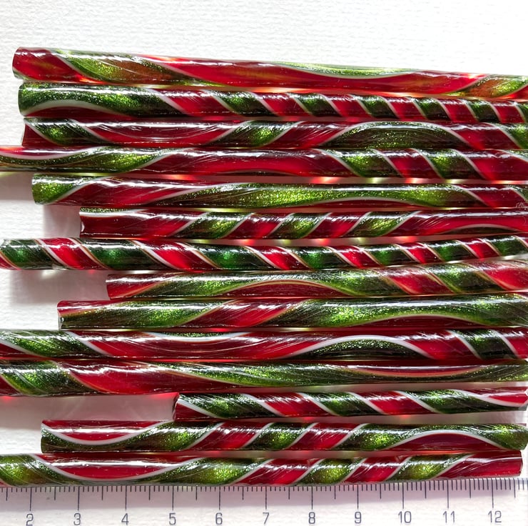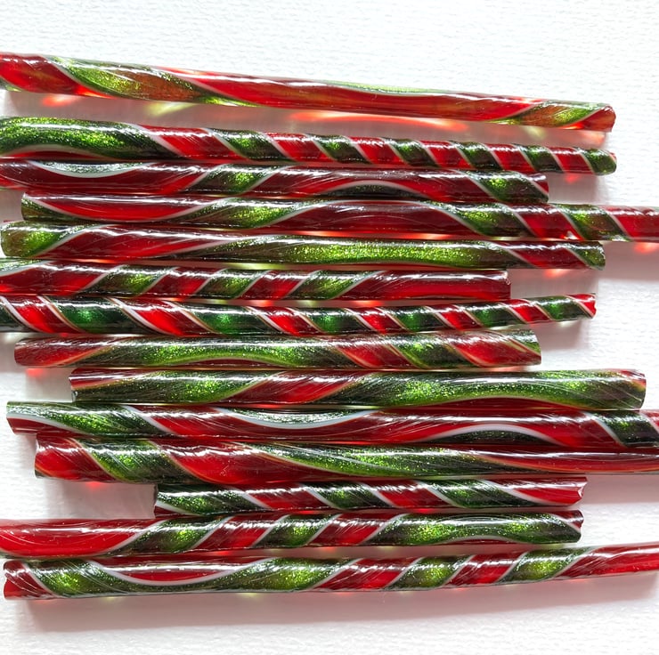 Christmas pack of twisty cane offcuts in red, white and sparkly aventurine green in a carnival long spiral design.