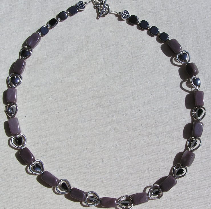 Purple Plum Jade & Black Hematite Crystal Gemstone Heart Necklace