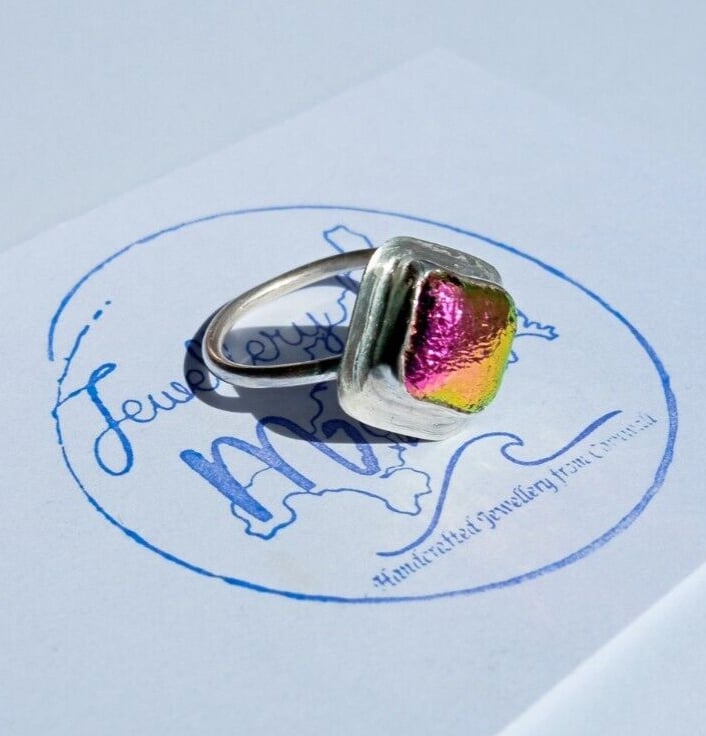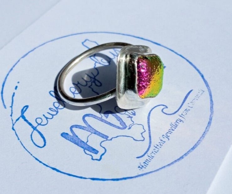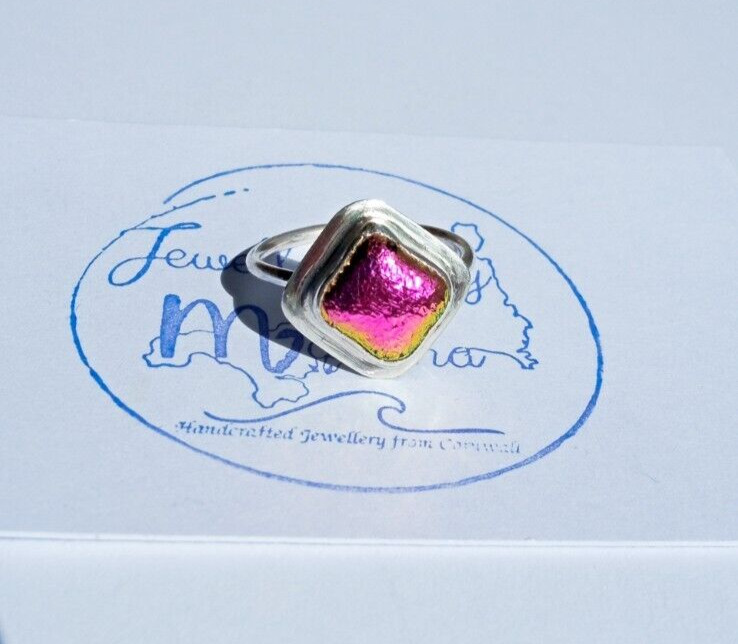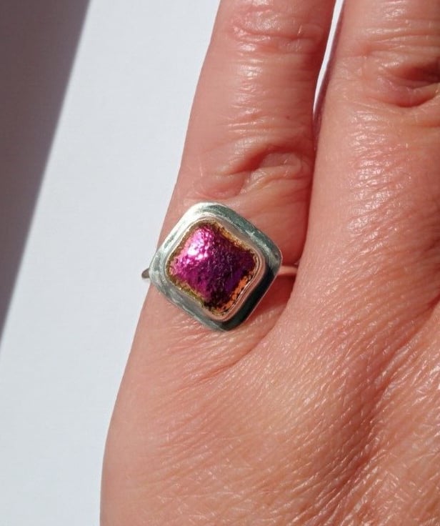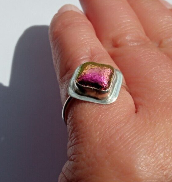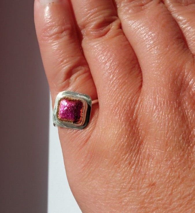 Fine Silver .999 & Recycled "Ecosilver" Silver .925 handmade ring with pink Foil Dichroic Glass Setting