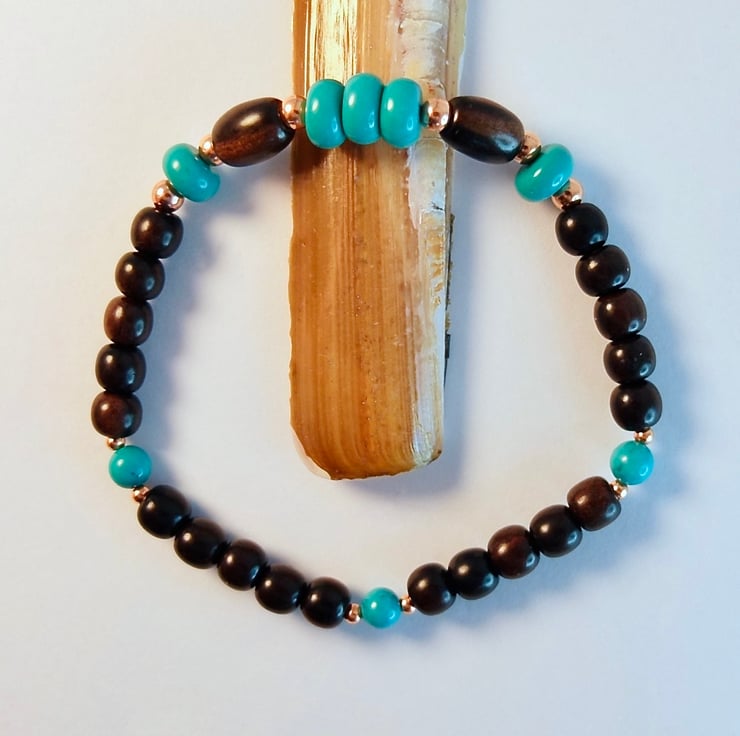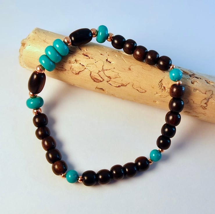 The natural wood sets off the blue-green colour of these genuine Turquoise beads, and both are complemented by the red-gold gleam of copper.