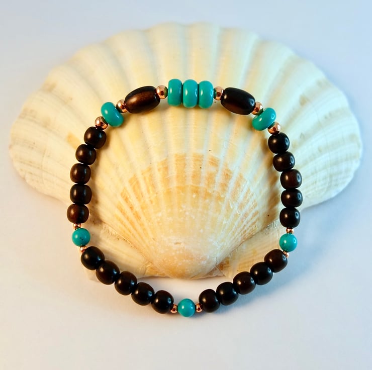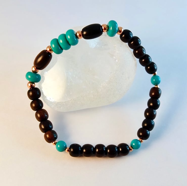 Elegant bracelet featuring a pair of dark brown Tiger Ebony wood 5x8mm rice beads, set with a trio of Hubei Province Turquoise 6mm rondelles, with a further one at each end, all highlighted with tiny 2mm pure copper spacers.