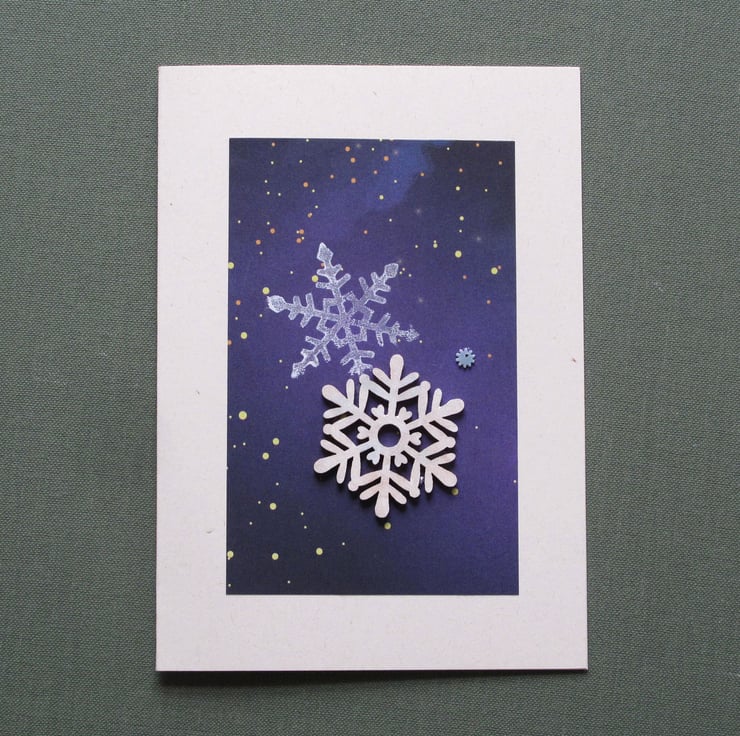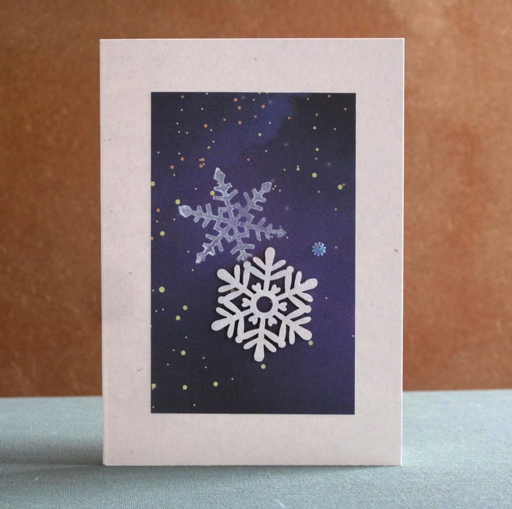 Unique handmade card. Each card has an original snowflake print with a wooden snowflake and small bead. The design is mounted on an A6 recycled paper card, with side fold and recycled paper envelope. Blank inside.