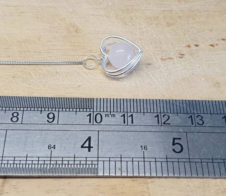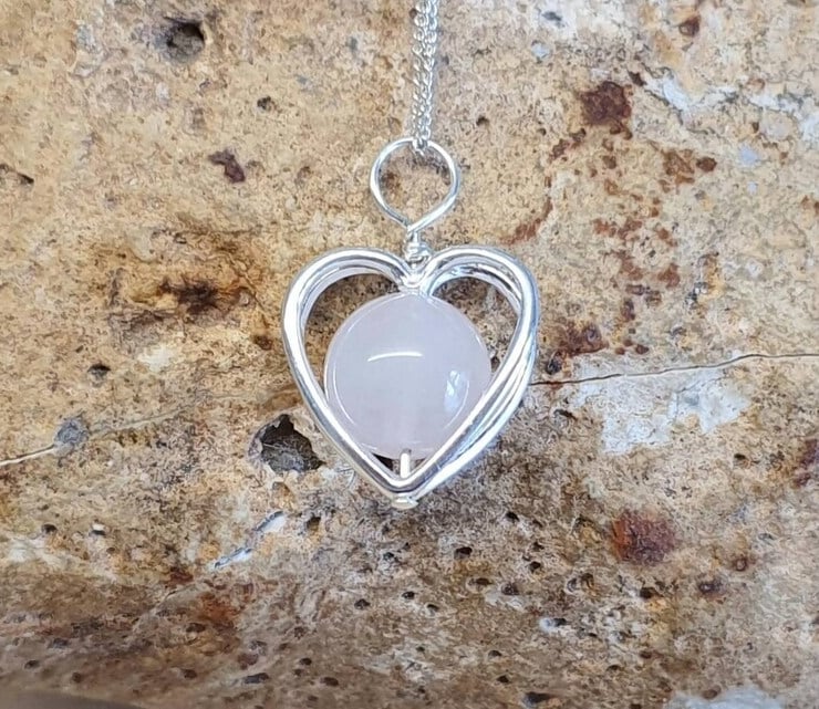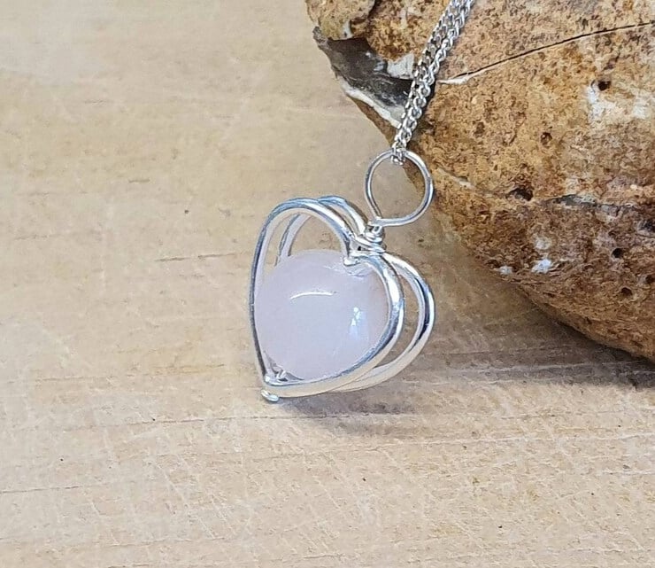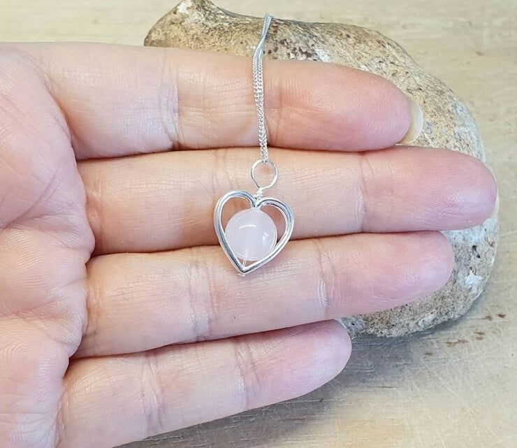 This is a women's small minimalist sterling silver rose quartz heart pendant necklace with a 3D heart frame.