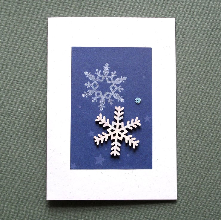 Unique handmade card. Each card has an original snowflake print with a wooden snowflake and small bead. The design is mounted on an A6 recycled paper card, with side fold and recycled paper envelope. Blank inside.