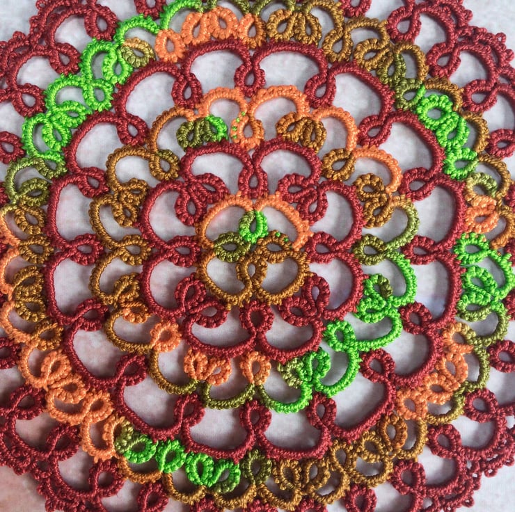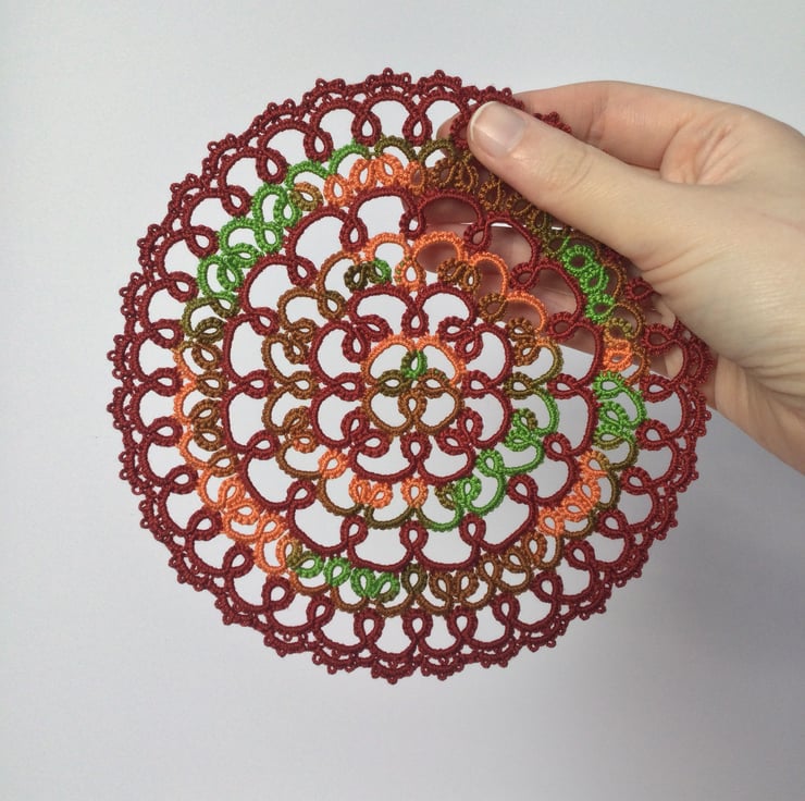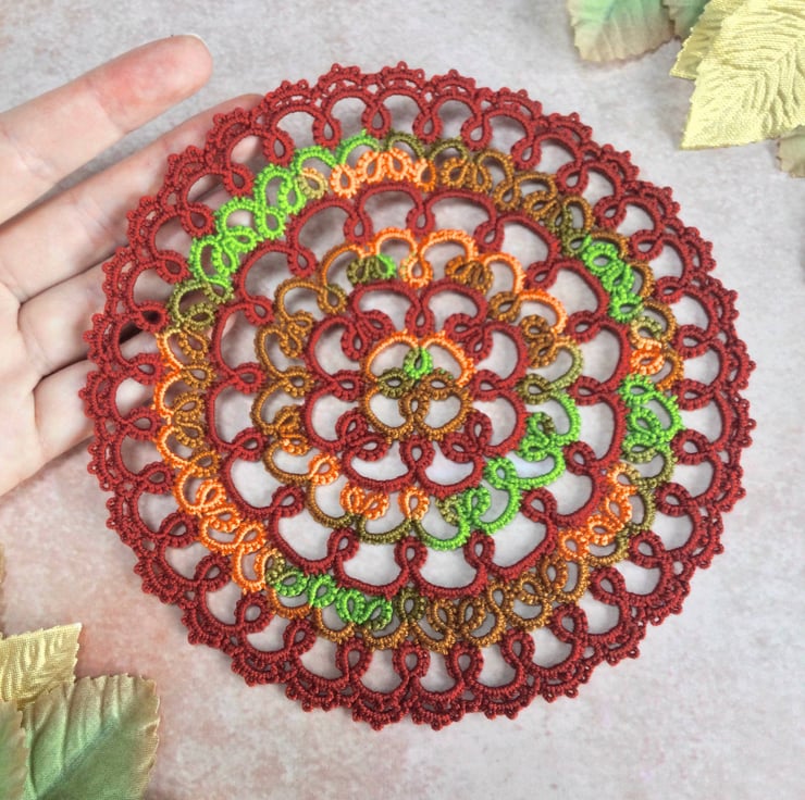 This small, autumn inspired round doily was carefully shuttle tatted in high quality cotton thread (a mix of rust red, rust orange, brown and apple green).