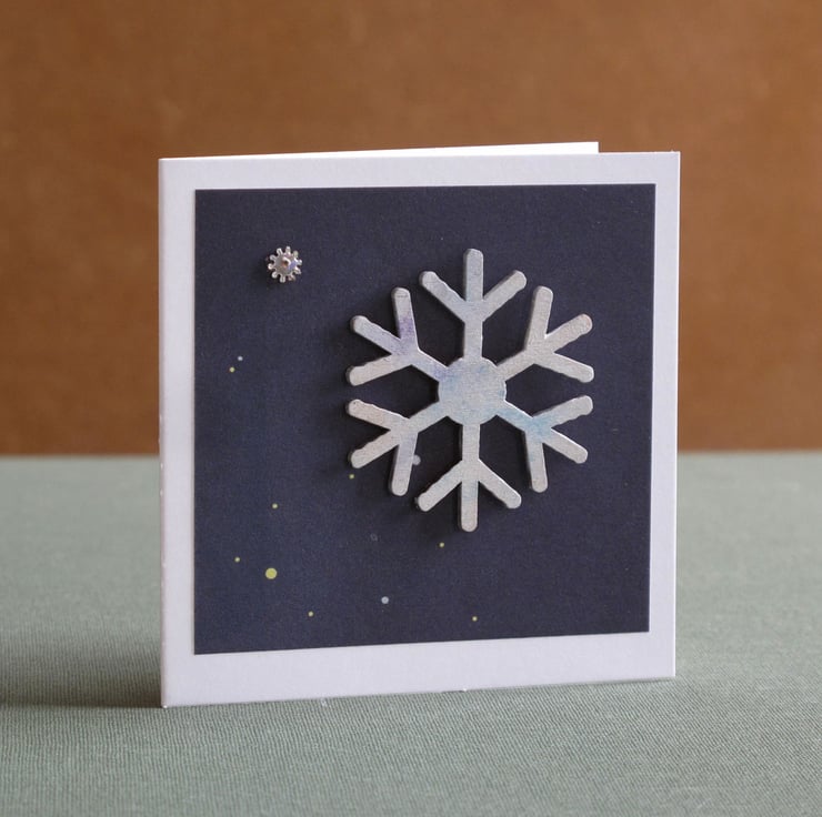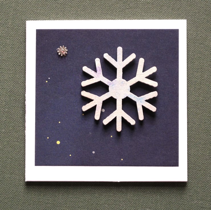 Unique handmade card. Each card has an original wooden snowflake and small bead. The design is mounted on an 3x3 inch card, with side fold and envelope. Blank inside.