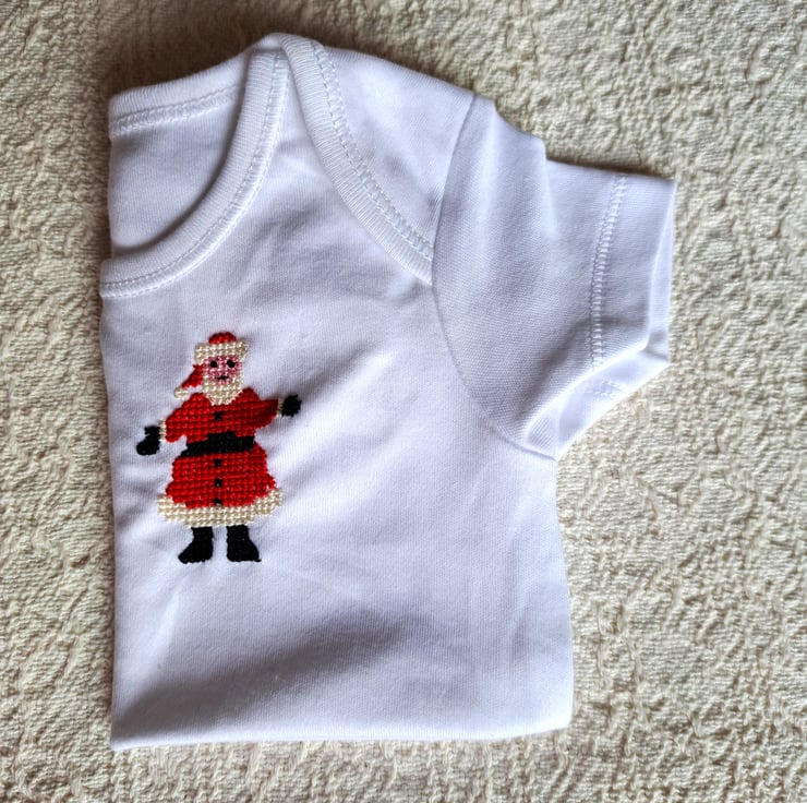 I have hand embroidered Father Christmas on the left front of this soft cotton baby vest/onesie. He is dressed in his traditional scarlet coat and hat, trimmed with white fur, with a black belt, gloves and boots. As I never use a permanent backing material, there is nothing inside to irritate your child's skin. The vest has short sleeves, an envelope neck and three press studs between the leg openings. It can be machine washed.