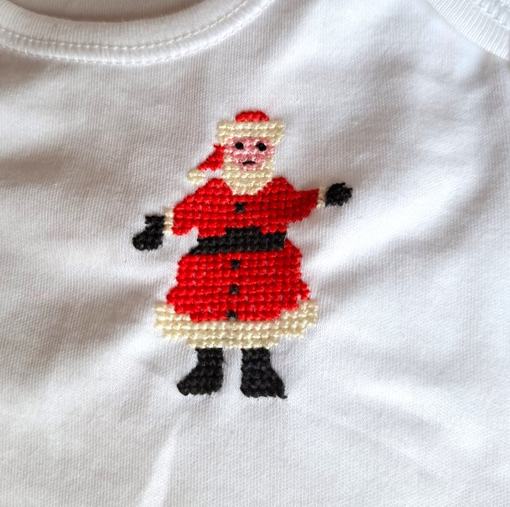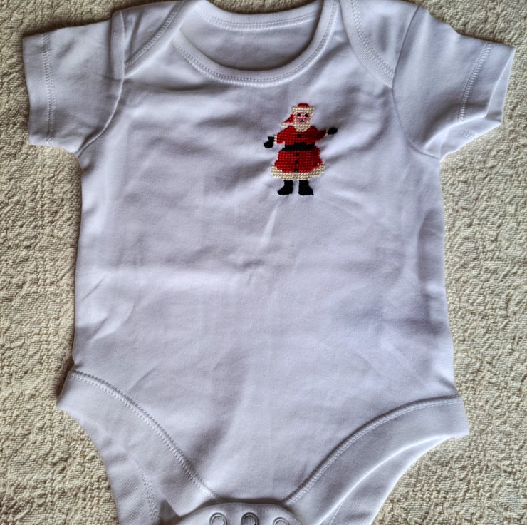 I have hand embroidered Father Christmas on the left front of this soft cotton baby vest/onesie. He is dressed in his traditional scarlet coat and hat, trimmed with white fur, with a black belt, gloves and boots. As I never use a permanent backing material, there is nothing inside to irritate your child's skin. The vest has short sleeves, an envelope neck and three press studs between the leg openings. It can be machine washed.