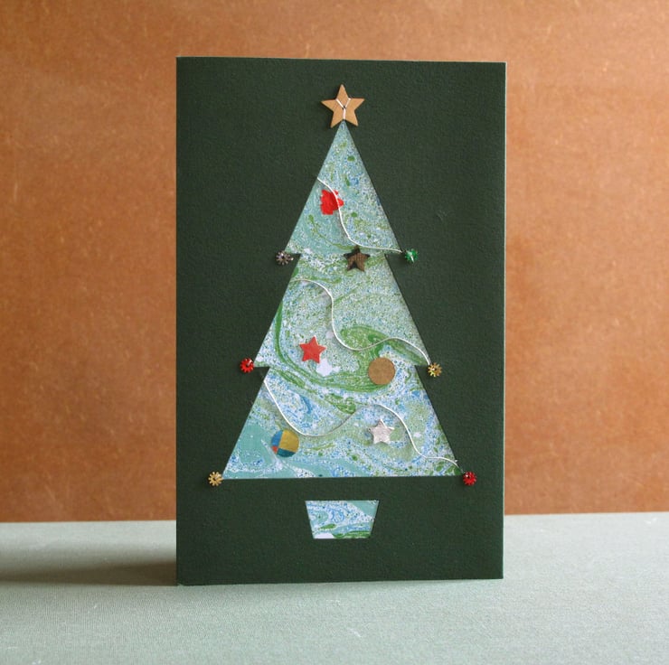 Unique card with cutaway Christmas Tree backed with marbled paper. Decorated with embroidered beads and cut out decorations. Blank card 4.5 x 7 ins with side fold.