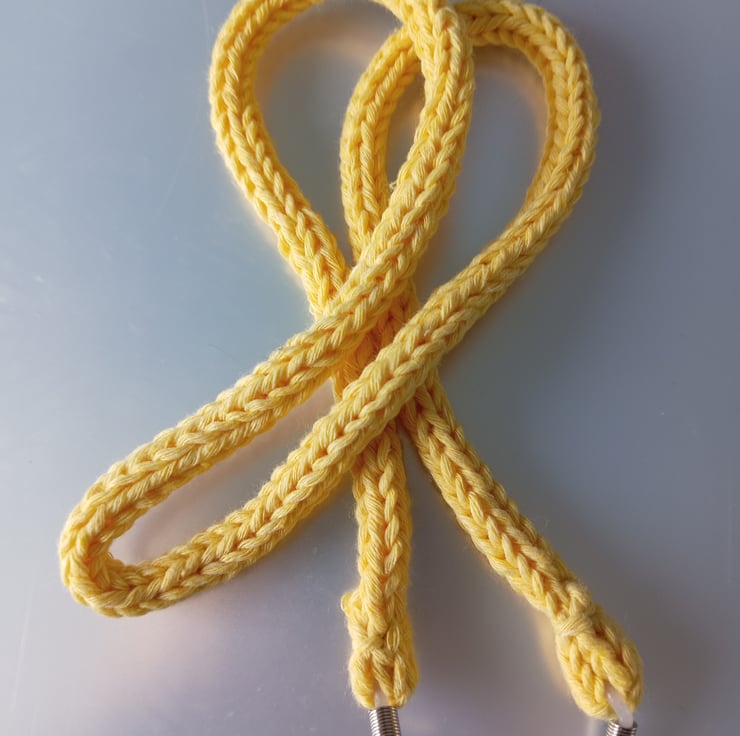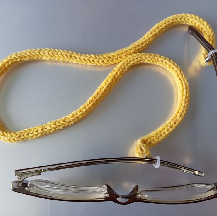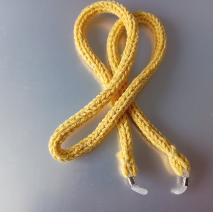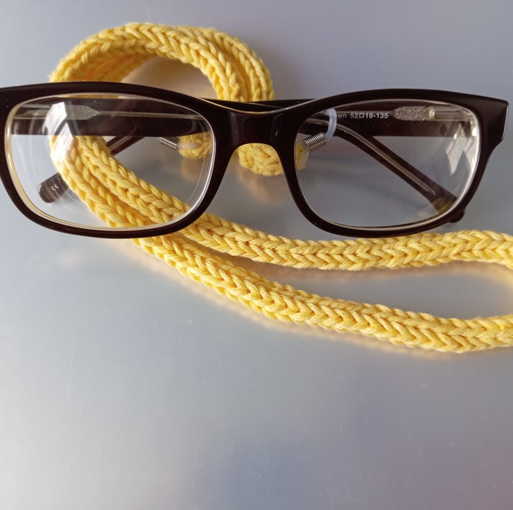 Handcrafted in an 80% cotton 20% mixed fibre yarn making it nice and comfortable to wear. It has white rubber ends to attach to your glasses.