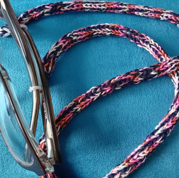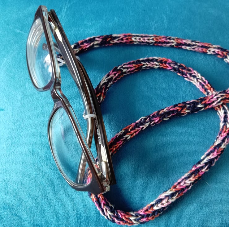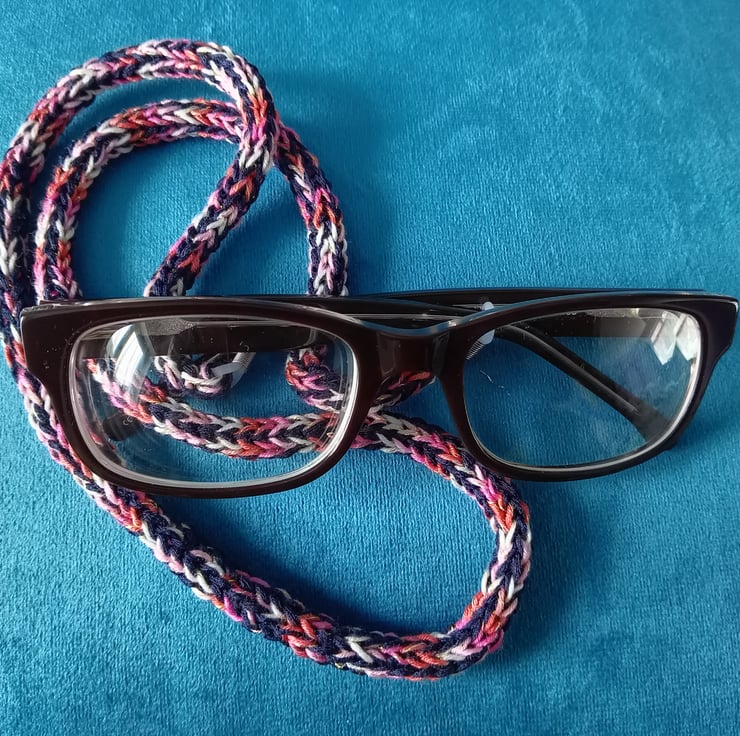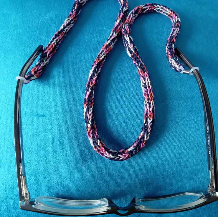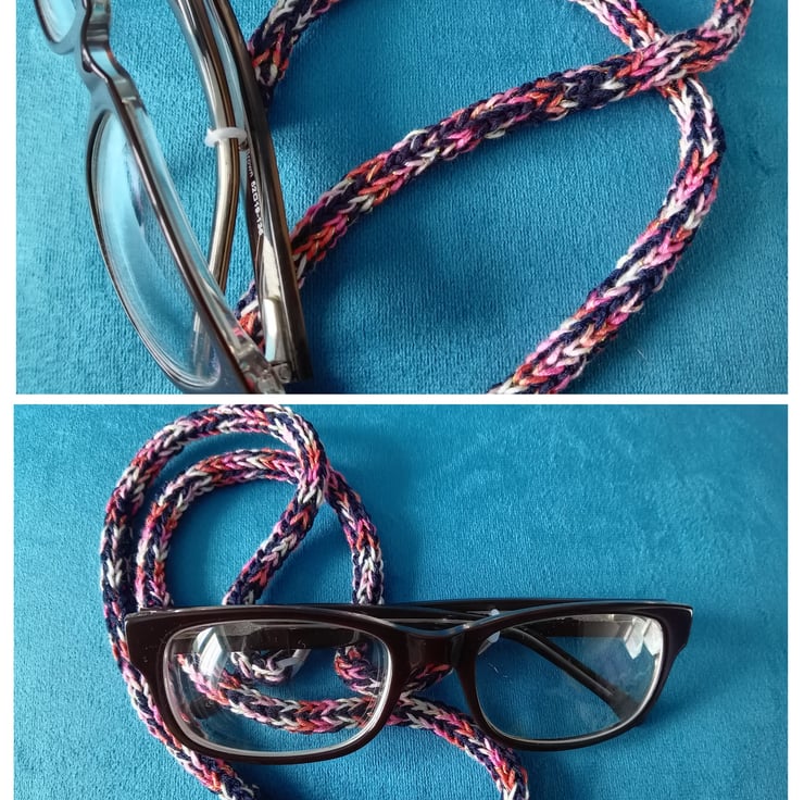 Handcrafted in an a cotton/acrylic mixed fibre yarn, making it nice and comfortable to wear. It has white rubber ends to attach to your glasses.