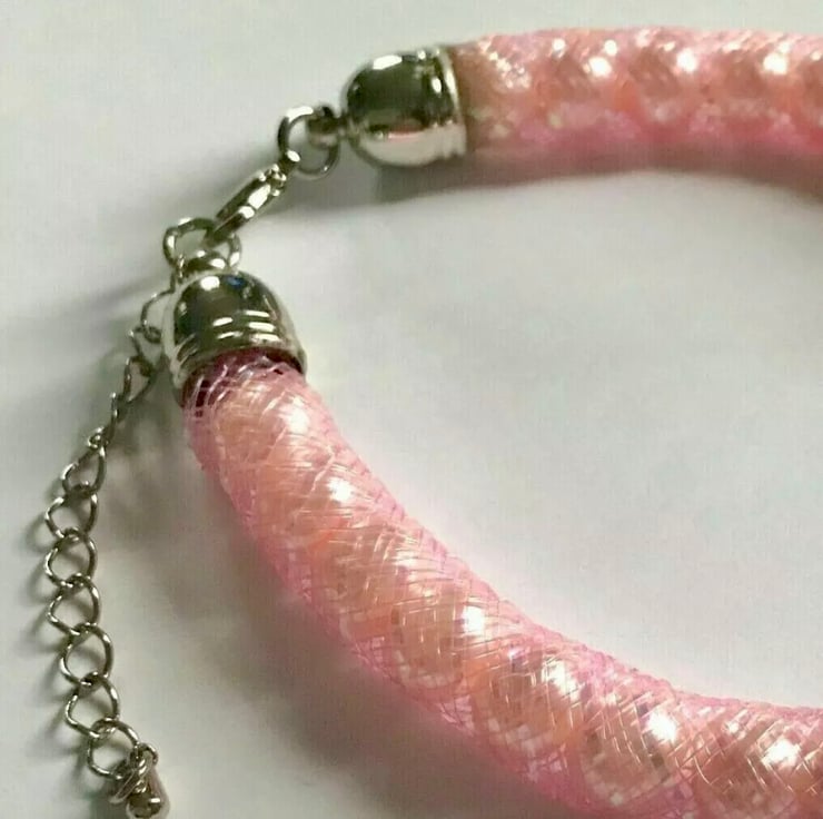 The Bracelet has been created using Nylon Mesh Tubing with a Sparkly Silver Strip running through it, and is completed by Silver Plated Bell shaped End Caps with a Lobster claw clasp and 6cm extension chain.