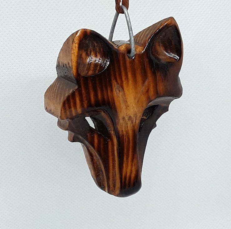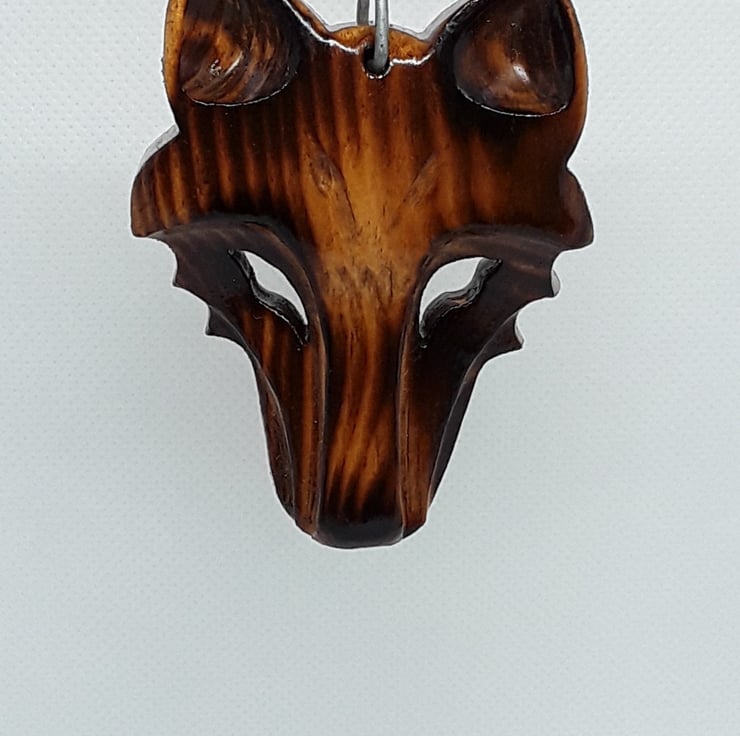 A stunning wolf Pendant Necklace, the grain of the wood is really highlighted on this piece, I have used a method of scorching the wood to highlight the grain, it is hand carved from recycled wood and is finished with two coats of yacht varnish, the metal fastener is made from galvanized steel and I provide enough cord to tie to the length you require, the size of the item is approximately 7X5.5cm,