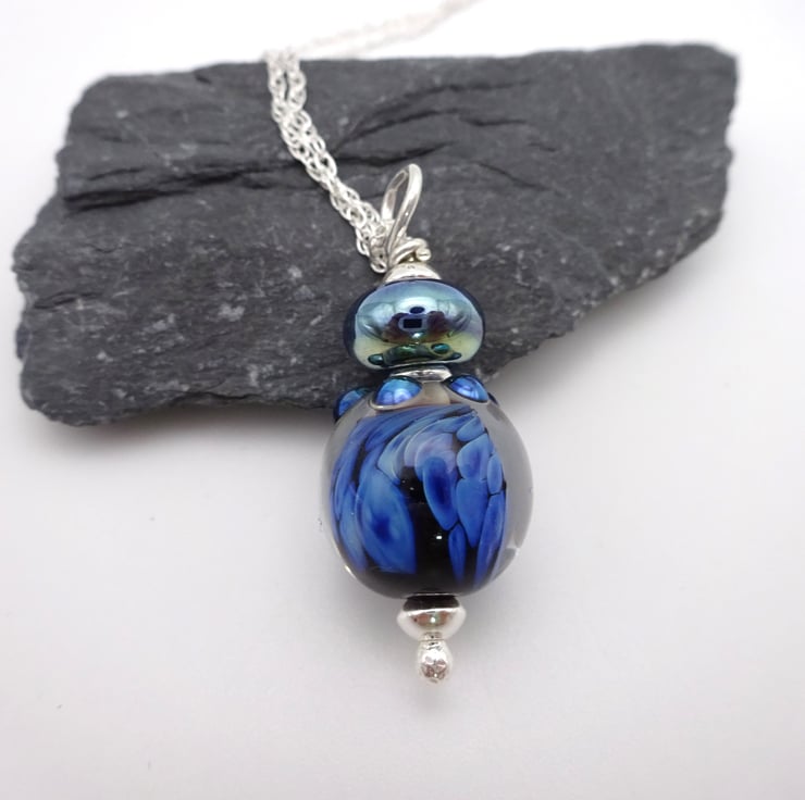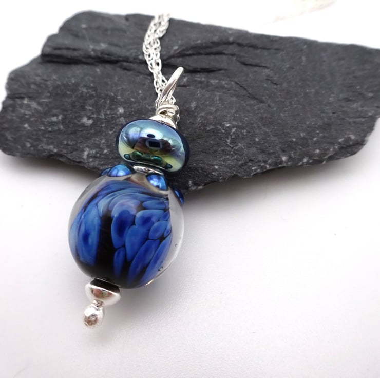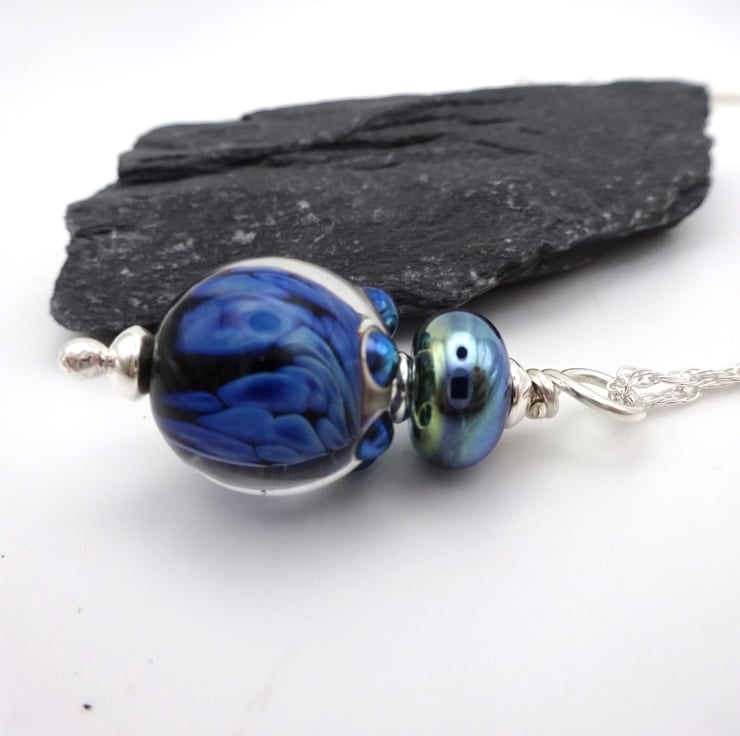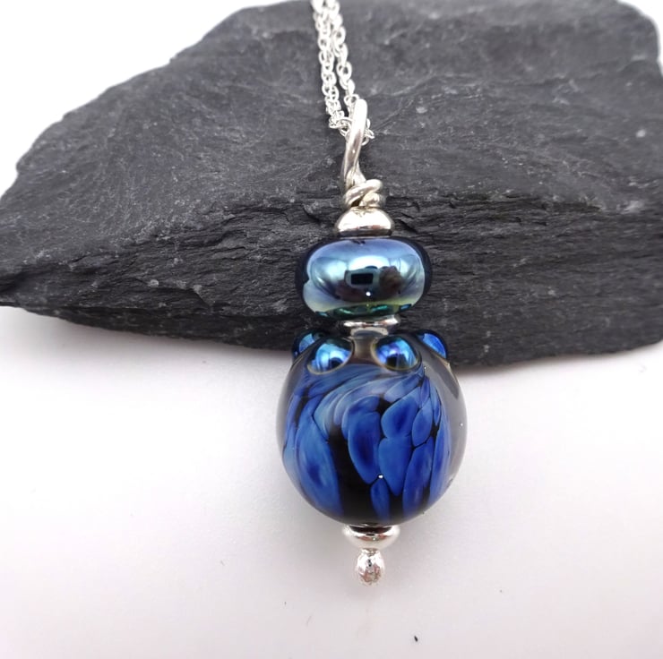 It features handmade lampwork glass beads made with blue reactive glass strung onto a sterling silver chain.