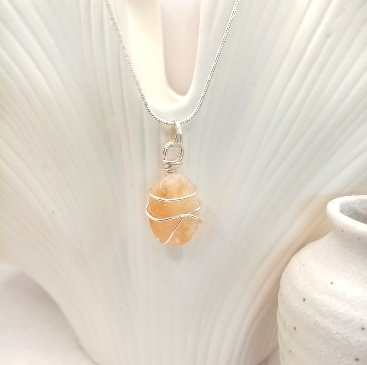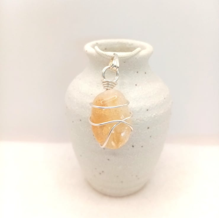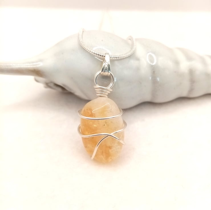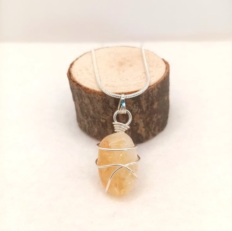 Wire wrapped natural Citrine tumble stone with silver plated snake chain.