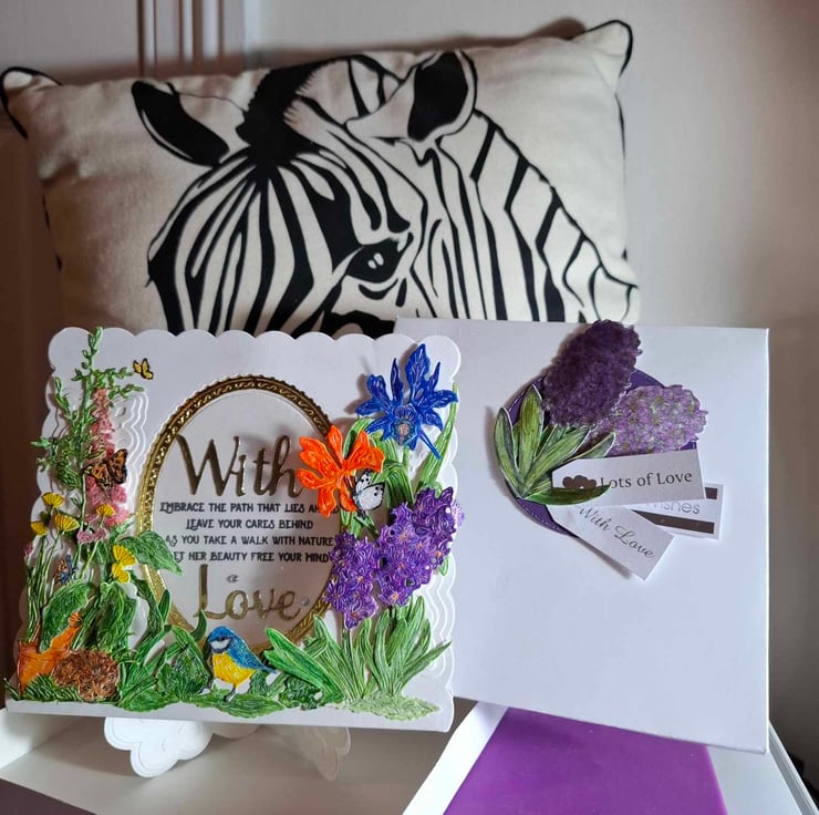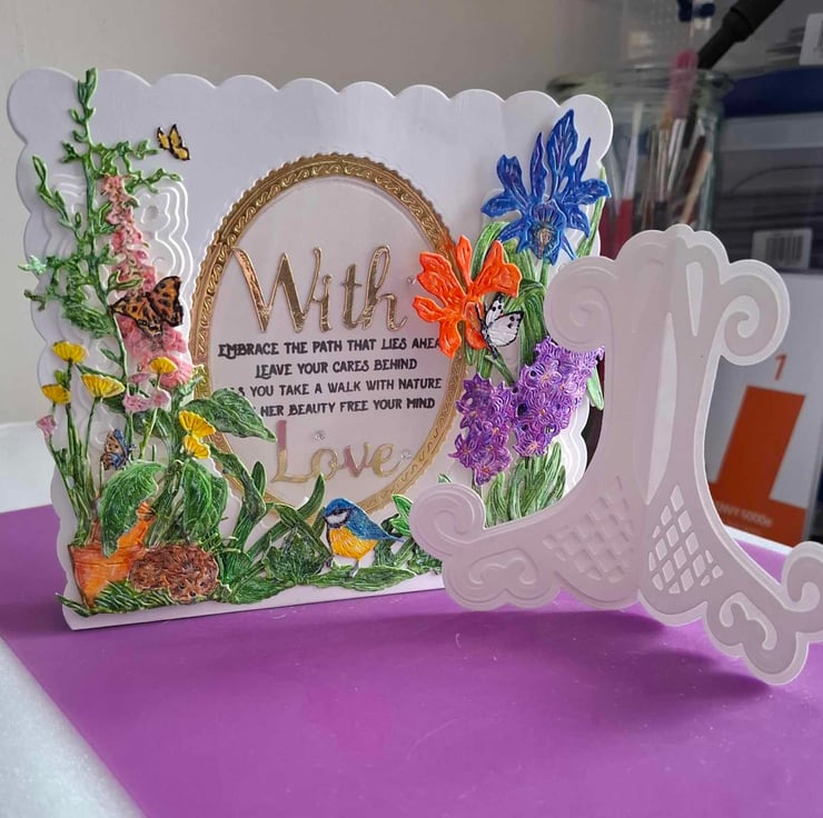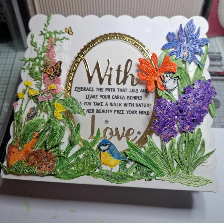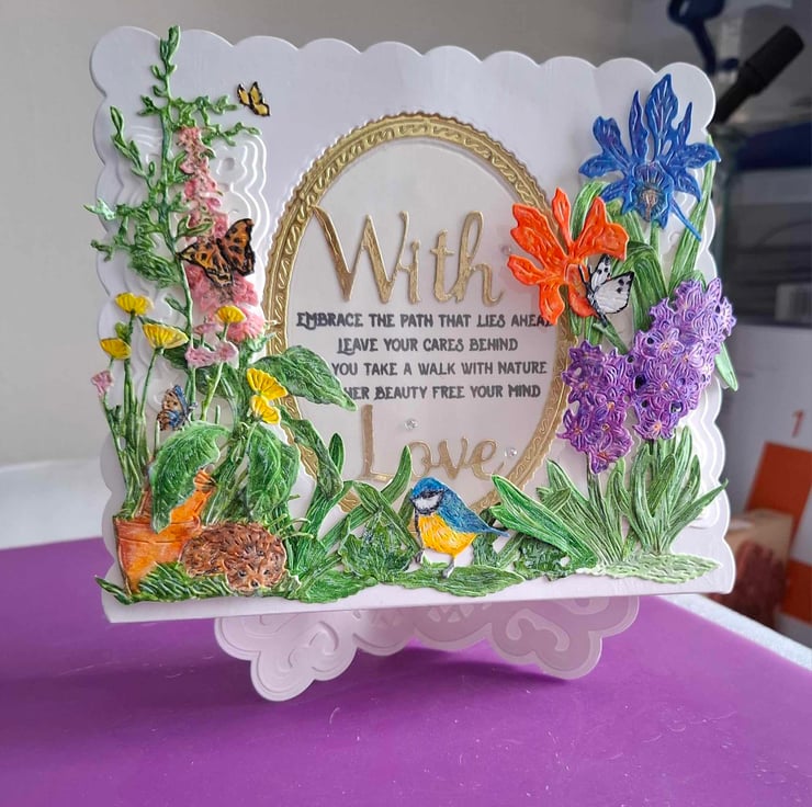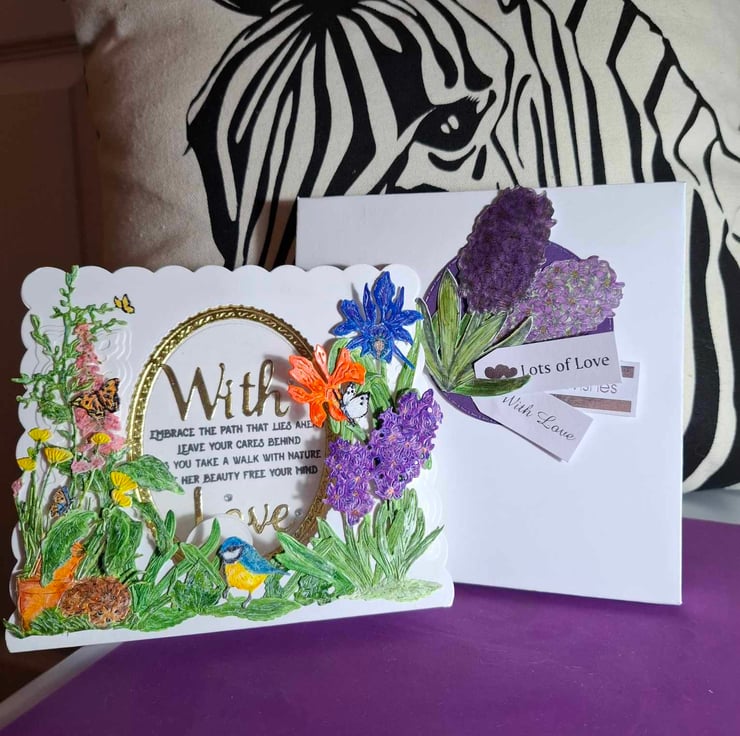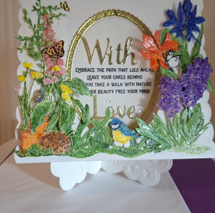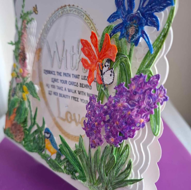 An Exquisite Hand Crafted No Verse Tent Card For All Occasions With A Unique Peek-A-Through Design, This Delightful Meadow Flowers Scene With Colourful Blooms Surrounding The Peek-A-Through Window Where A Lovely Sentiment Can Be Viewed, While A Cheeky Little Blue Tit Comes To Say Hello, The Realism And 3D Effect Makes You Imagine A Gentle Breeze Flow Through The Flowers Making Them Sway And Dance To The Symphony Of Nature That You Could Forget It Is All Made Of Card. Each Card Is Crafted With Intricate Detail For A Delight To Treasure And Will Be Shown With A Box Or Envelope Where Applicable Also Prices Reflect the Hours Of Creating This Unique Card And Quality Of Materials Used.