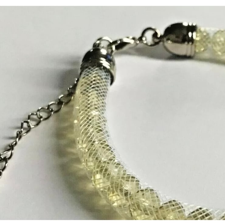A Hand Crafted Mesh Bracelet filled with Pale Lemon Beads.